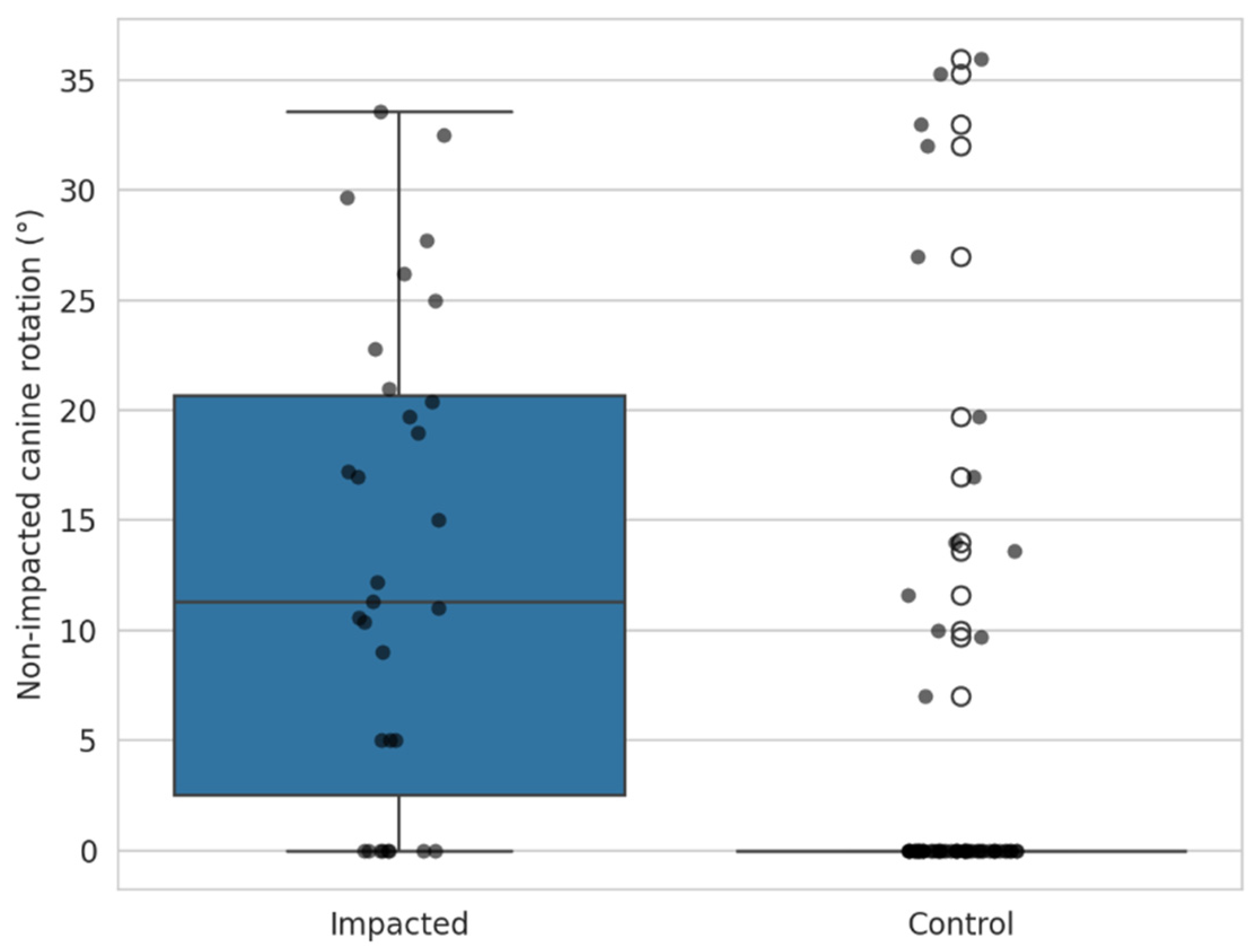 Figure 5. Rotation of the contralateral non-impacted canine in the impacted group compared to the canines in the control group.