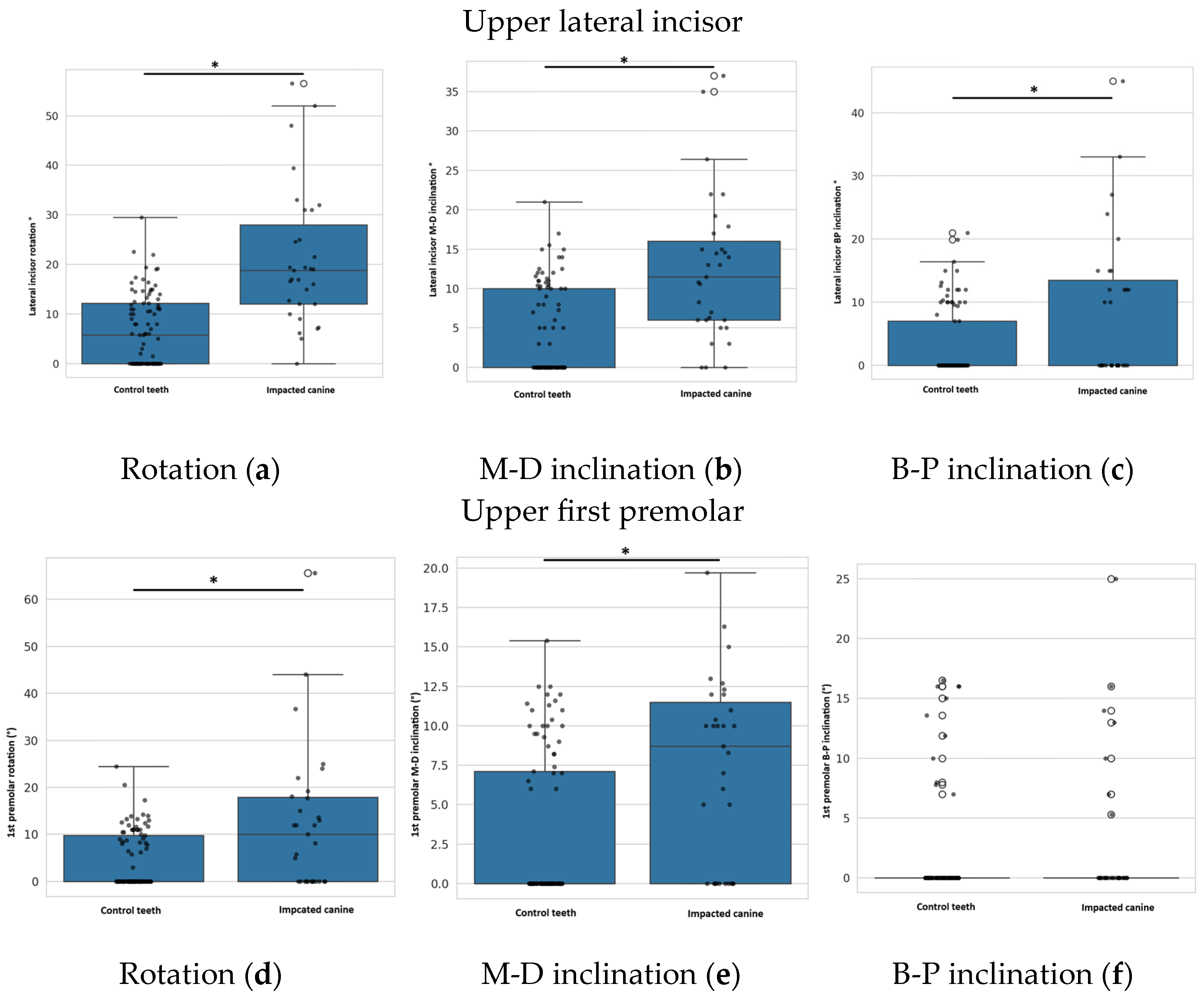 Figure 6. Rotation (a), M-D inclination (b) and B-P inclination (c) of lateral incisor adjacent to impacted canine compared to control teeth. Rotation (d), M-D inclination (e) and B-P inclination (f) of 1st premolar adjacent to impacted canine compared to control teeth. An asterisk (*) indicates a statistically significant difference with p-value ≤ 0.05.