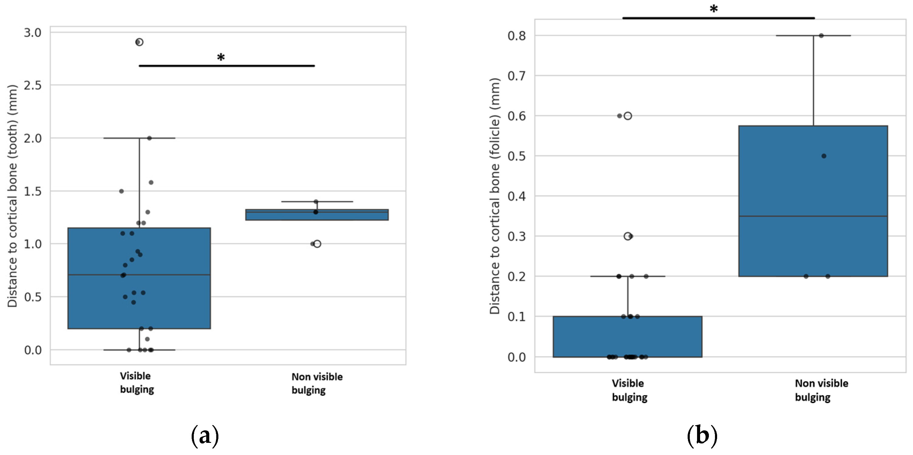 Figure 7. Visibility of mucosal bulge in relation to CBCT measured distance between outer cortical bone margin and impacted canine (a) or impacted canine dental follicle (b). An asterisk (*) indicates a statistically significant difference with p-value ≤ 0.05.