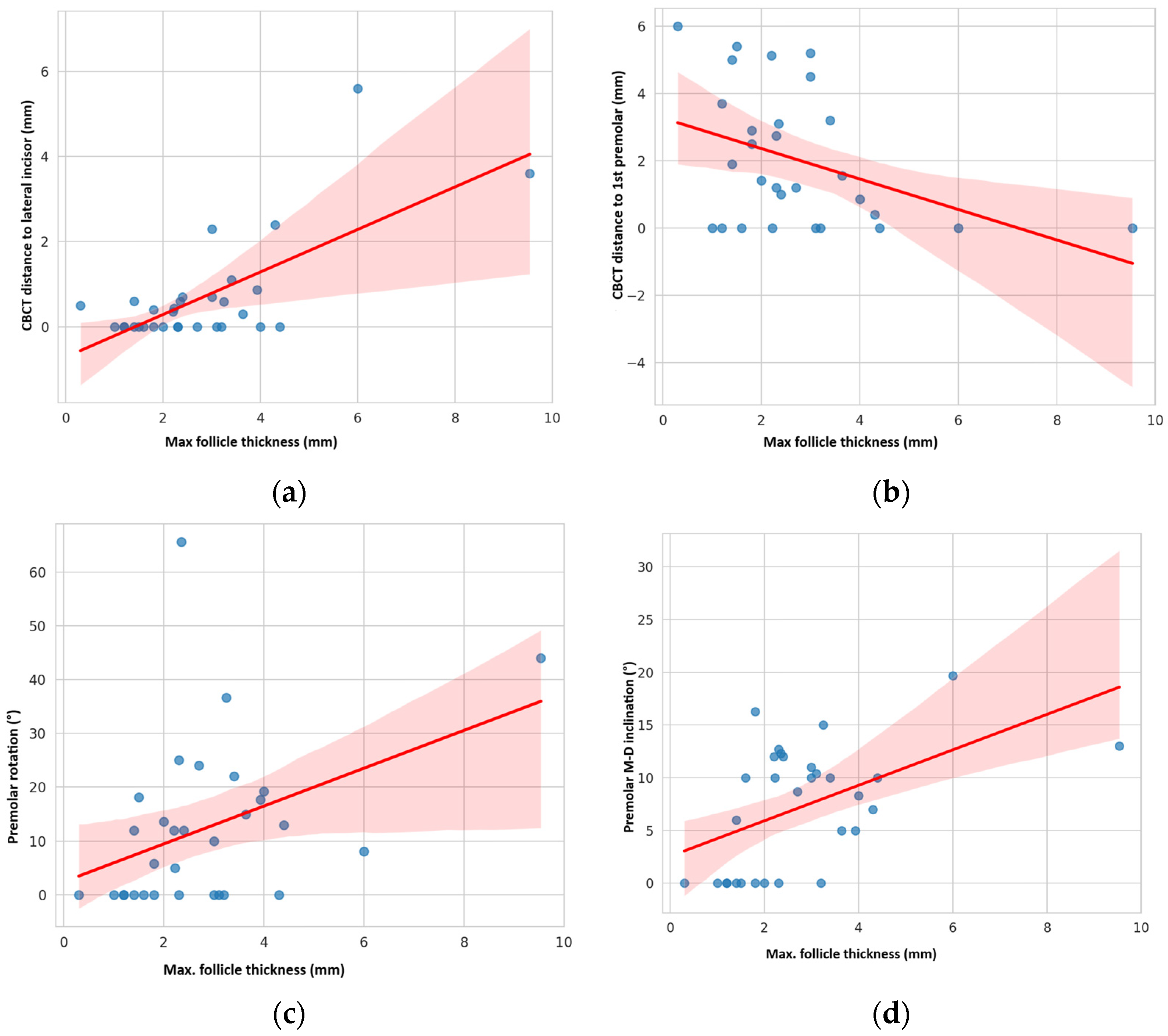 Figure 8. Correlation between maximal impacted canine follicle thickness and distance to lateral incisor (a) or distance to 1st premolar (b). Maximal follicle thickness was positively correlated with 1st premolar rotation (c) and its M-D inclination (d).