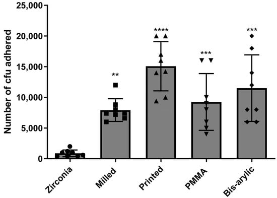 Combined mean number of CFUs of C. albicans and S. mutans that adhered to all four provisional materials and zirconia. A total of nine samples per group were tested, and colonies were counted via direct plate count and light microscopy. (**** p < 0.0001, *** p < 0.001 and ** p < 0.01).