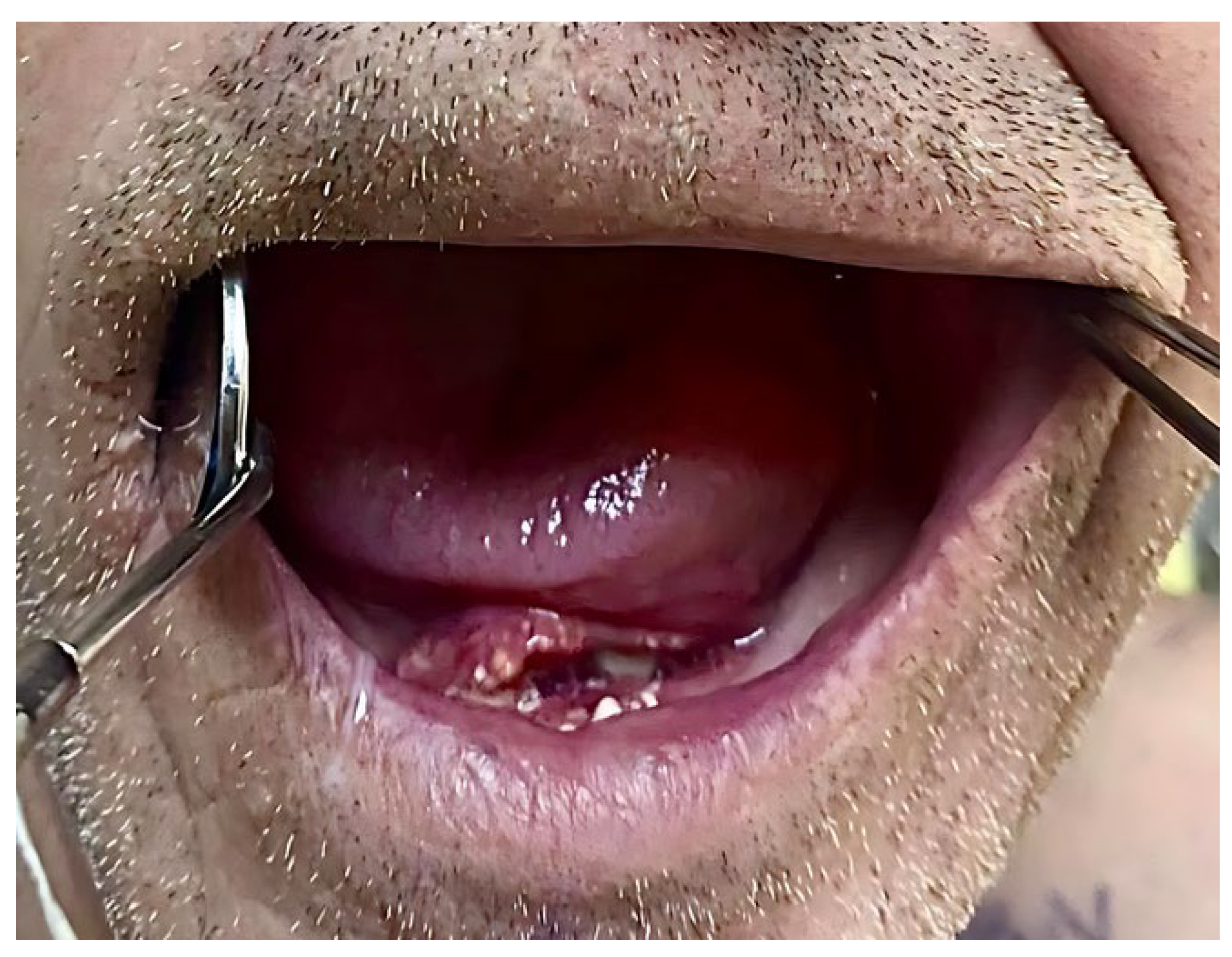 A 51-year-old male patient from Târgu Mureș, Romania, initially presented to his general dentist seeking comprehensive dental care. The patient, who was fully edentulous, reported progressive ill-fitting of his dentures and painful mastication, with symptom onset approximately six months prior to presentation. Intraoral clinical examination revealed an ulcerated lesion with a necrotic base, irregular margins, and overlying fibrinous exudate, located along the left mandibular alveolar ridge and floor of the mouth, extending to the ventrolateral surface of the tongue.
