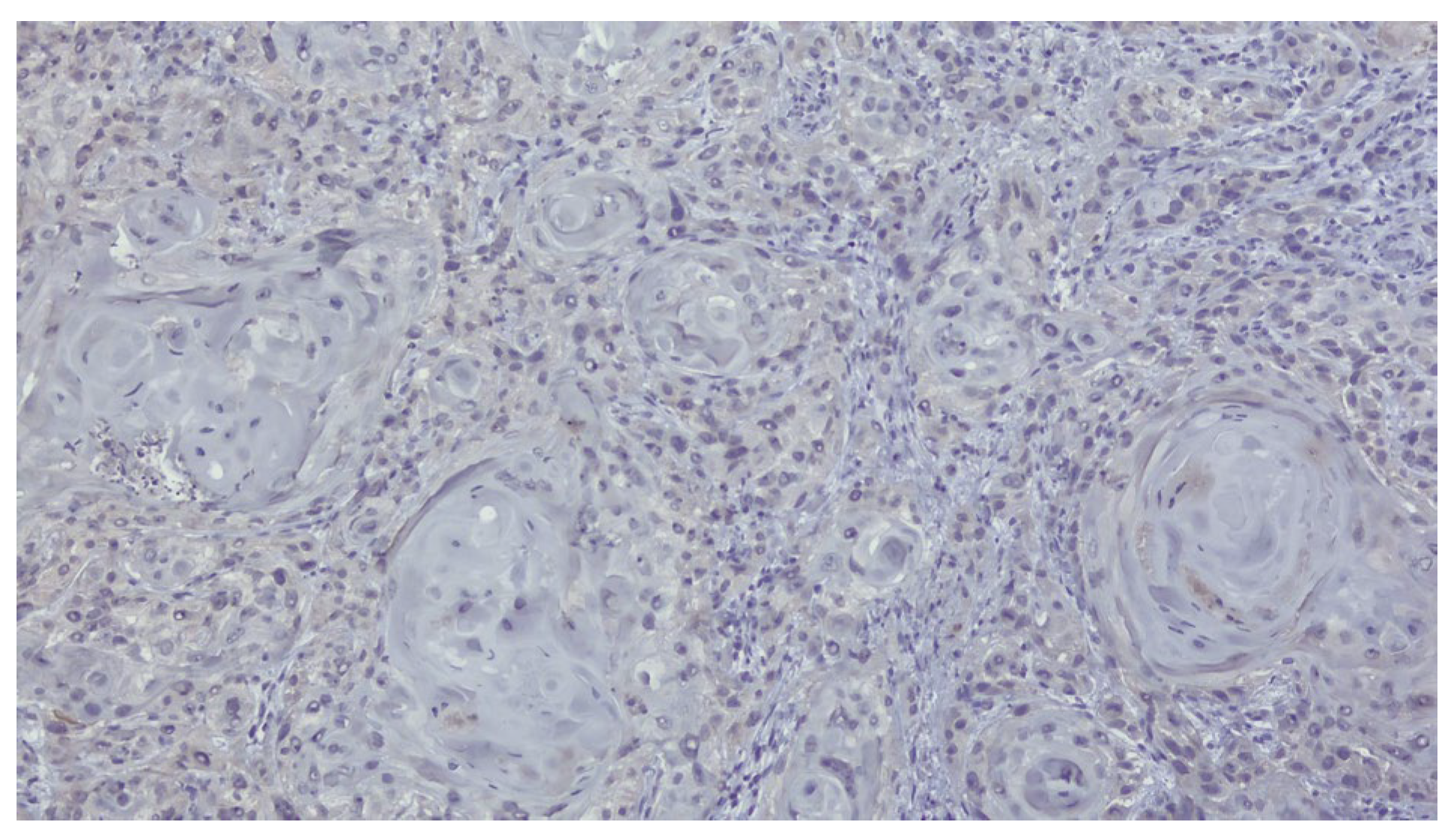 The patient was referred to the Department of Oral and Maxillofacial Surgery for further evaluation and management. Following an outpatient consultation and comprehensive clinical examination, no palpable cervical lymphadenopathy was identified on physical assessment. Incisional biopsy of the oral lesion was performed under local anesthesia and the histopathological analysis of the biopsy specimen subsequently confirmed the diagnosis of moderately differentiated keratinizing squamous cell carcinoma grade II Immunohistochemical staining for p16 was also performed and showed a negative result, indicating that the lesion was not HPV-related but more consistent with a conventional, tobacco-associated carcinogenesis pathway (