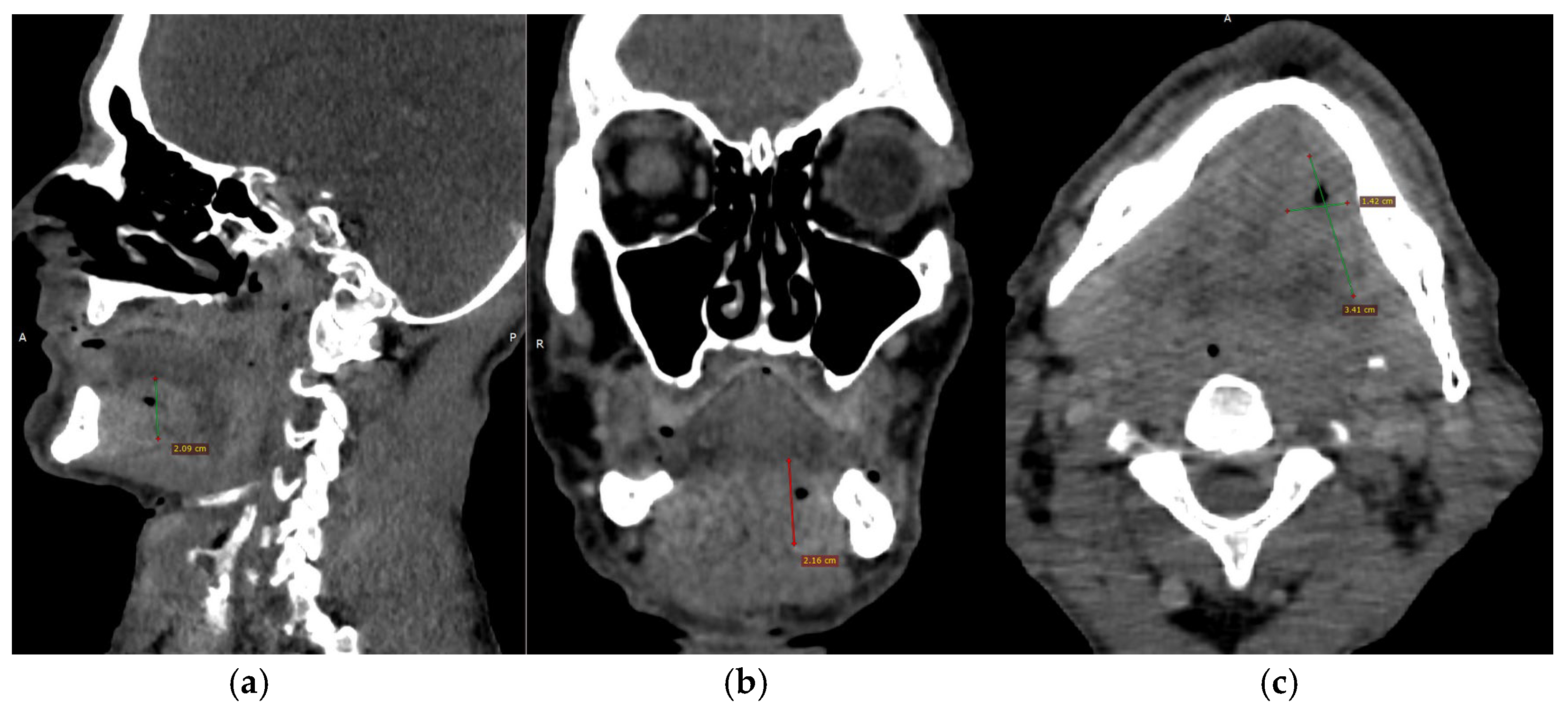 CECT of the oral and submandibular region revealed a heterodense lesion within the left sublingual space, measuring approximately 34 × 13 × 20 mm, with a depth of 18 mm (