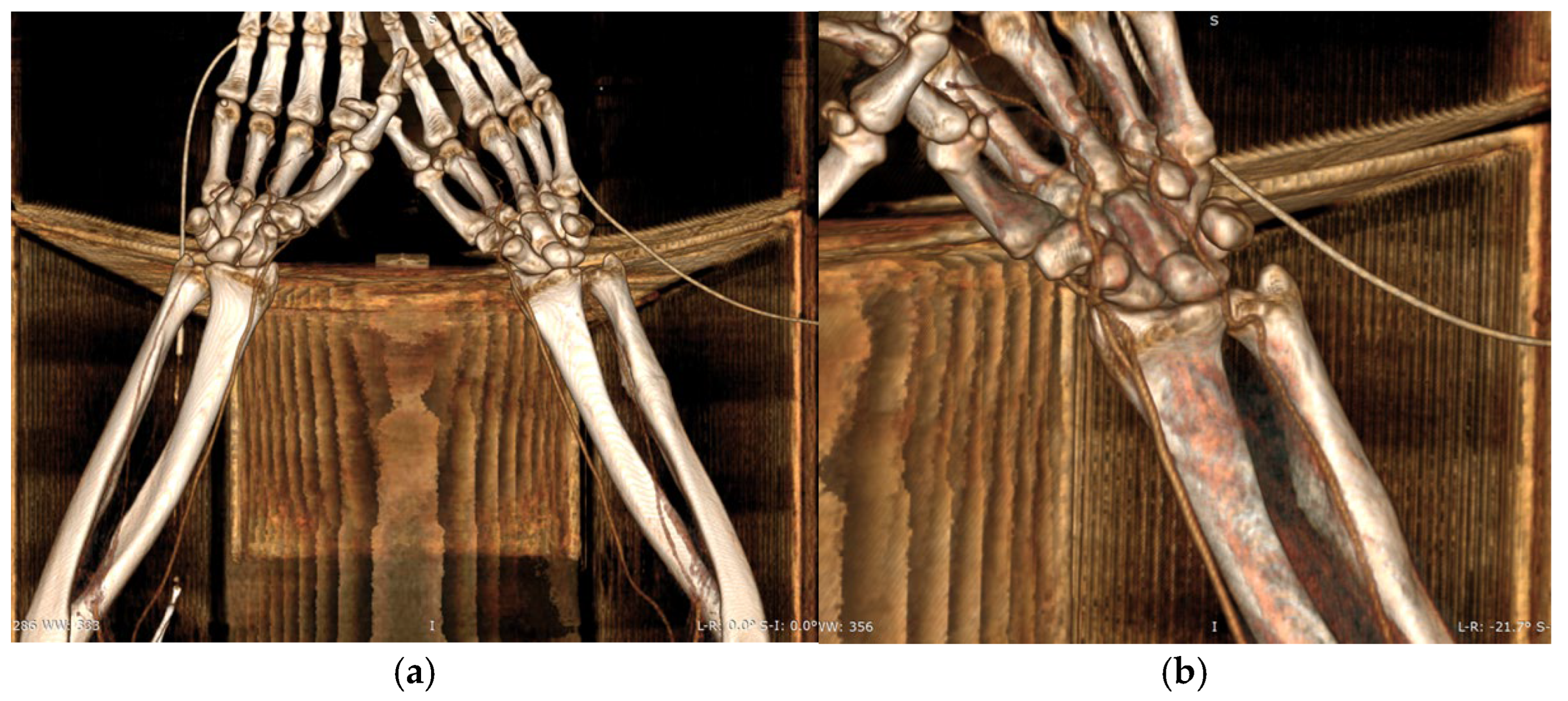 CTA of the left upper limb demonstrated a fully patent arterial axis with preserved caliber and no pathological or anatomical abnormalities throughout the vascular course. The venous system was likewise patent, symmetrically configured, and of normal caliber bilaterally. No acute or suspicious alterations were noted in the soft tissues of the deltoid, axillary, brachial, ulnar, or forearm compartments on either side. Additionally, there were no radiologic signs of acute or chronic bone lesions within the examined regions. CTA of the right upper limb revealed a similarly patent and anatomically preserved arterial axis. However, a small, calcified atheromatous plaque was observed approximately 1 cm distal to the brachial artery bifurcation, producing only a minimal, clinically insignificant degree of luminal narrowing (