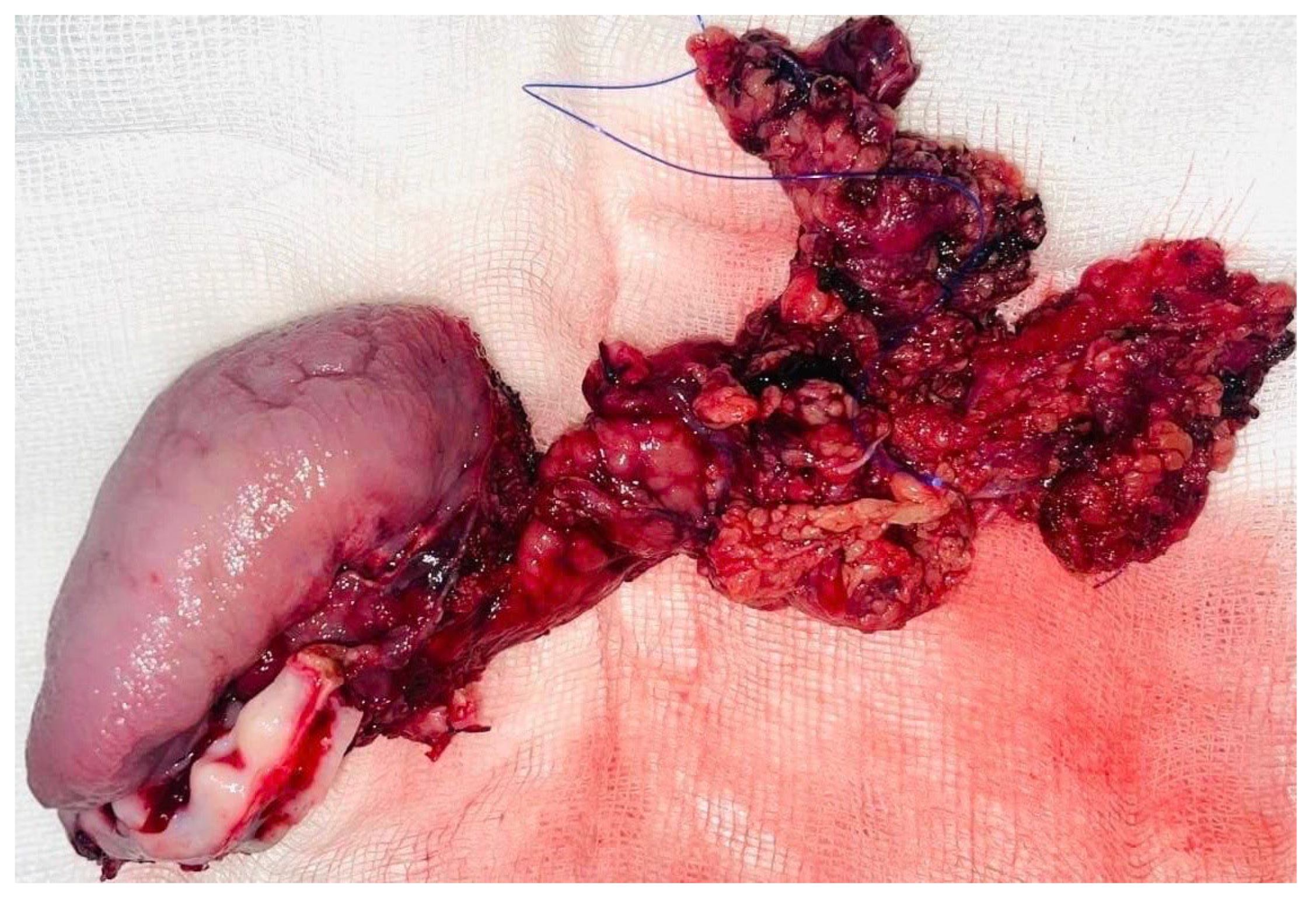 Tumor resection was subsequently performed with a macroscopic oncologic safety margin of approximately 1 cm. The primary surgical specimen, including the neoplasm, associated lymph node groups, and the submandibular salivary gland, was removed en bloc via a transoral approach. The specimen was immediately fixed in 10% buffered formalin and submitted for definitive histopathological evaluation (