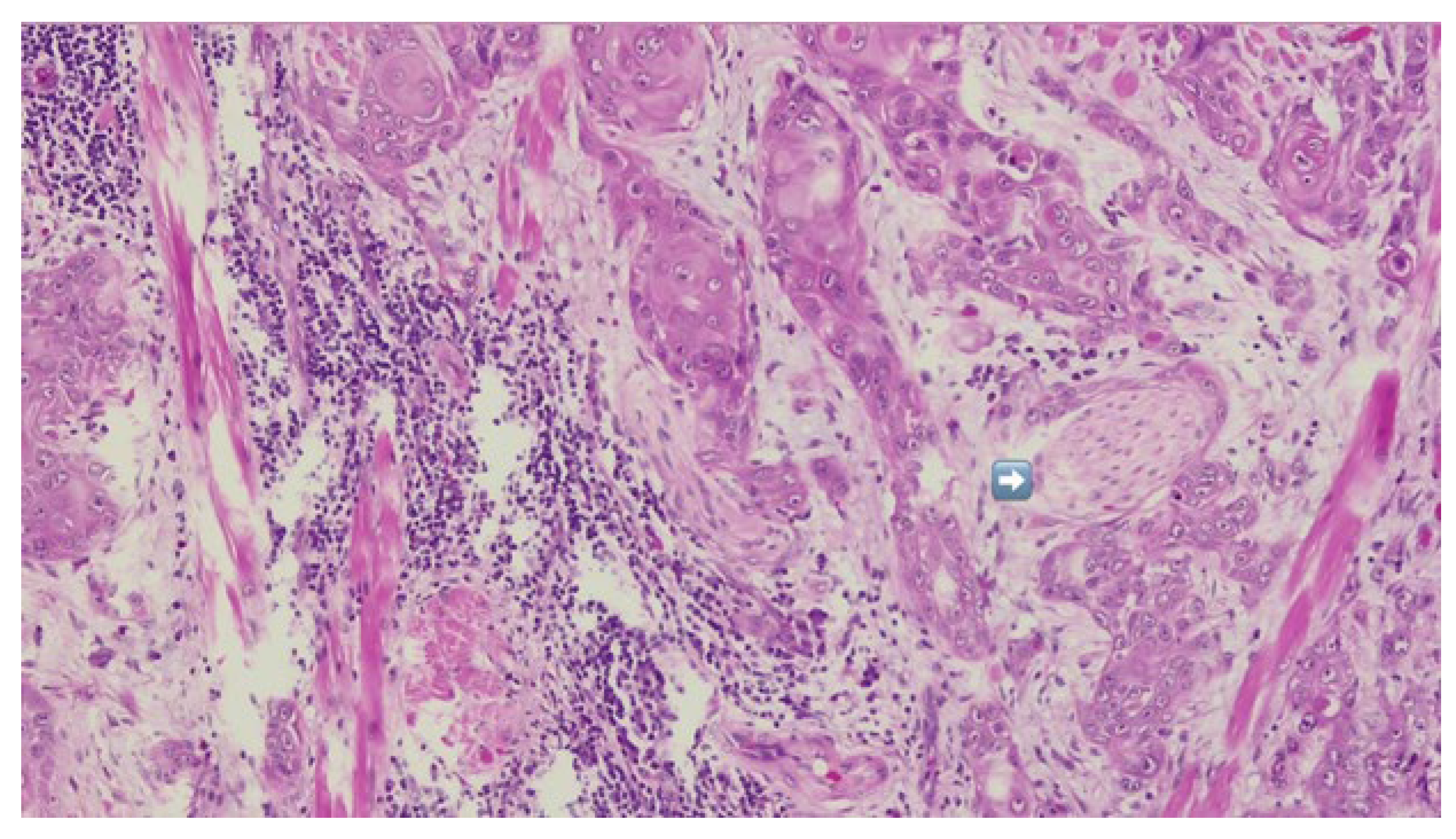 Definitive histopathological analysis of the surgical specimen confirmed a moderately differentiated keratinizing squamous cell carcinoma with evidence of perineural invasion (