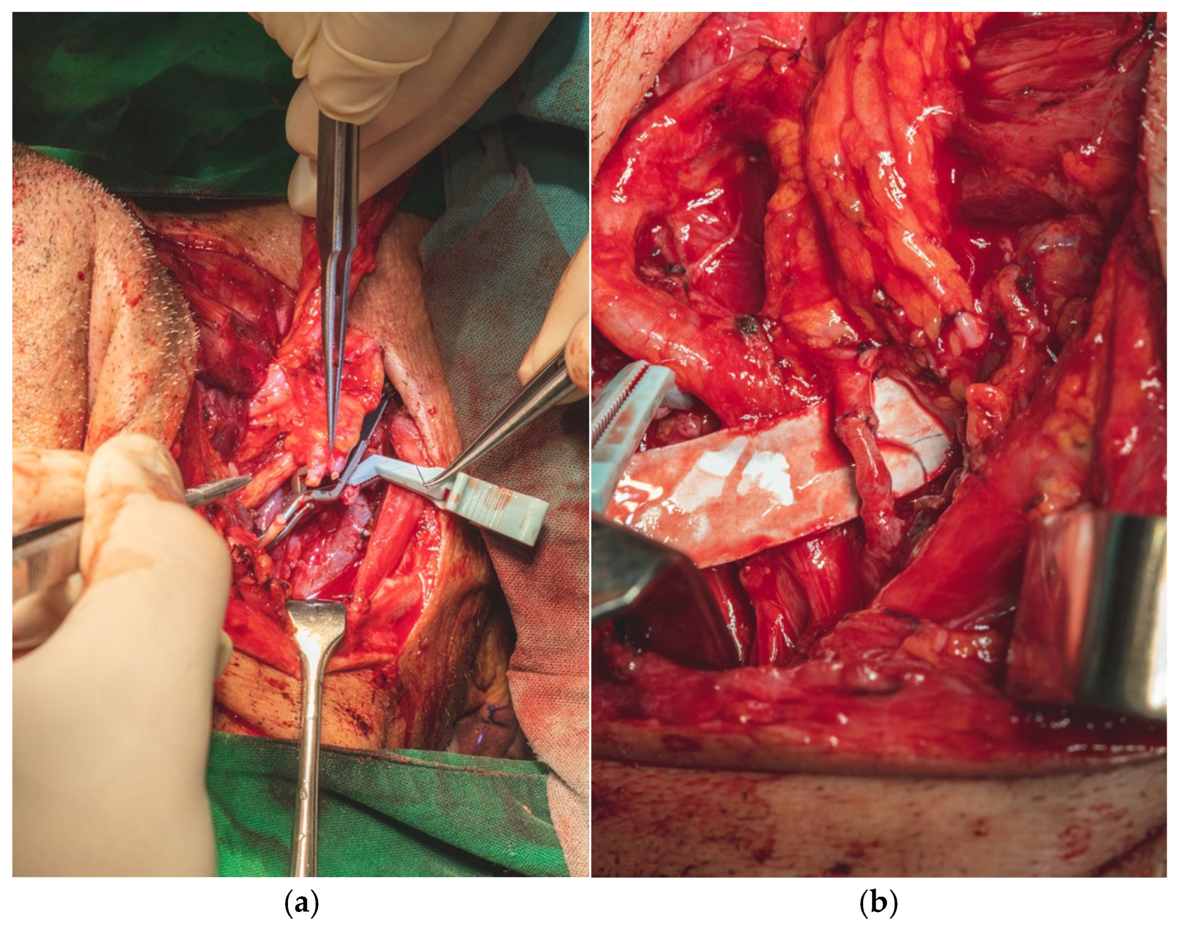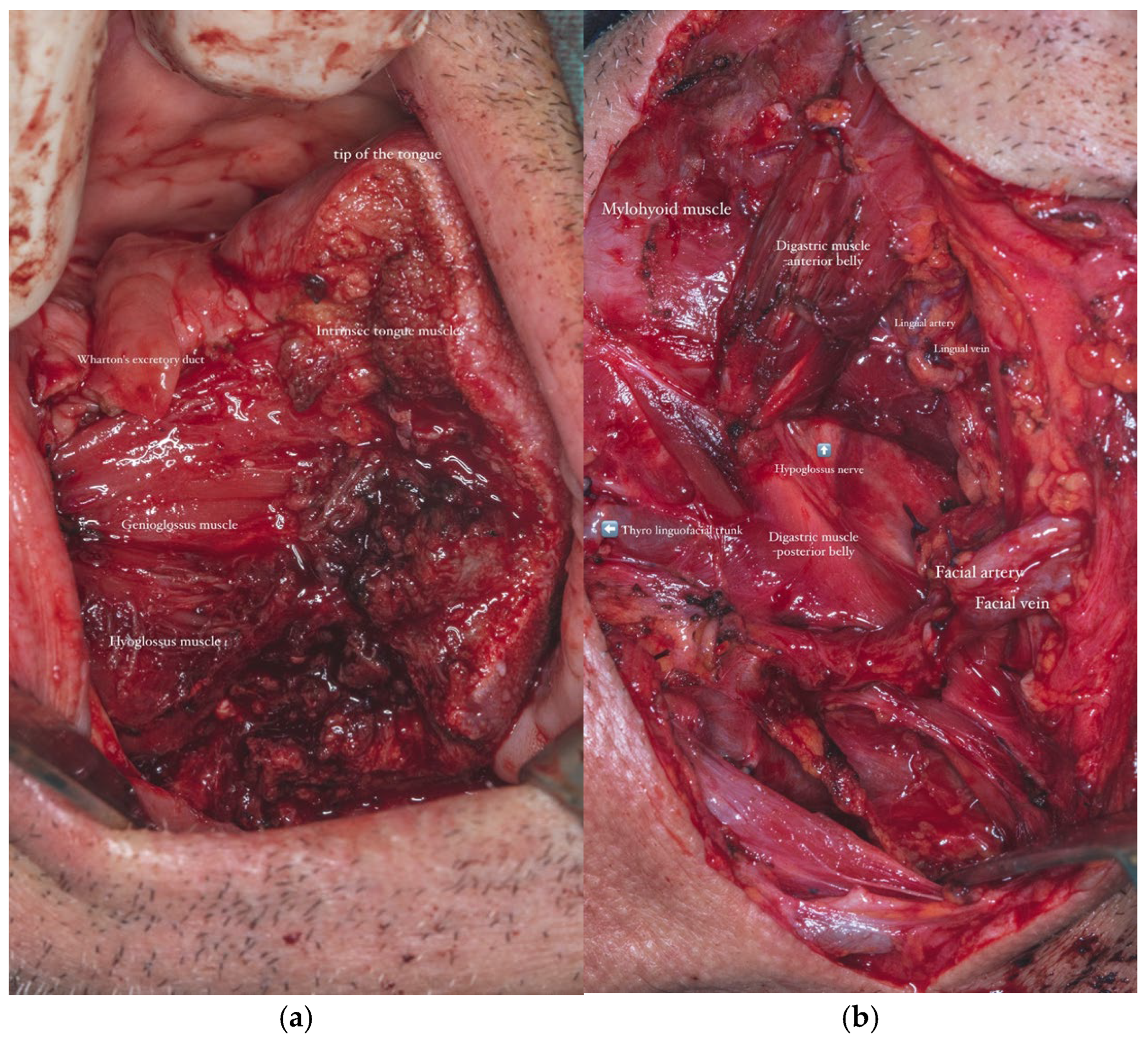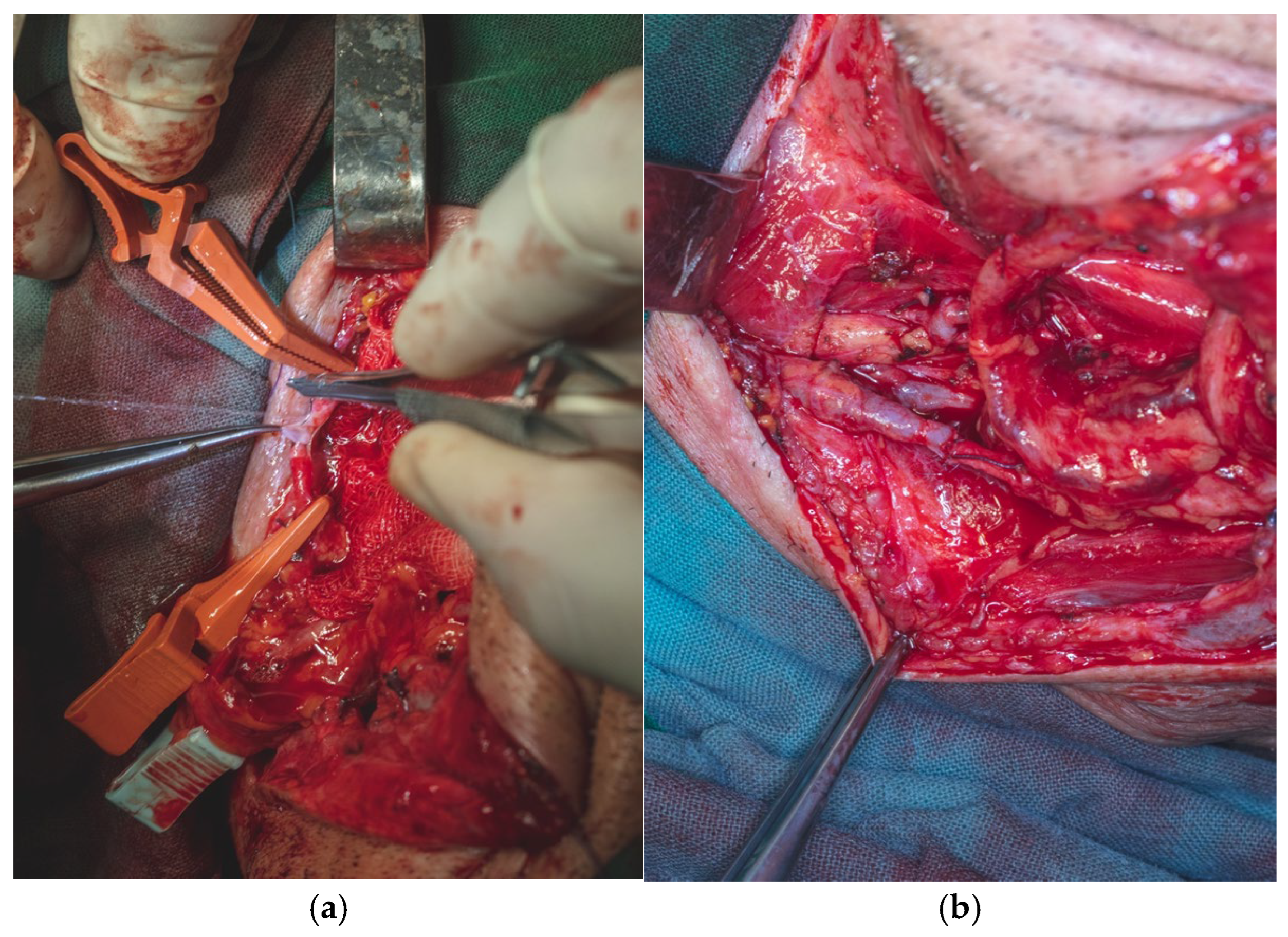 In parallel, dissection and identification of the left facial artery and the anterior jugular vein were performed, as these vessels were selected as the recipient sites for the subsequent microvascular anastomoses during the reconstructive phase. The chosen tissue needed to closely approximate the characteristics of the native tissues in order to ensure optimal functional and aesthetic outcomes (