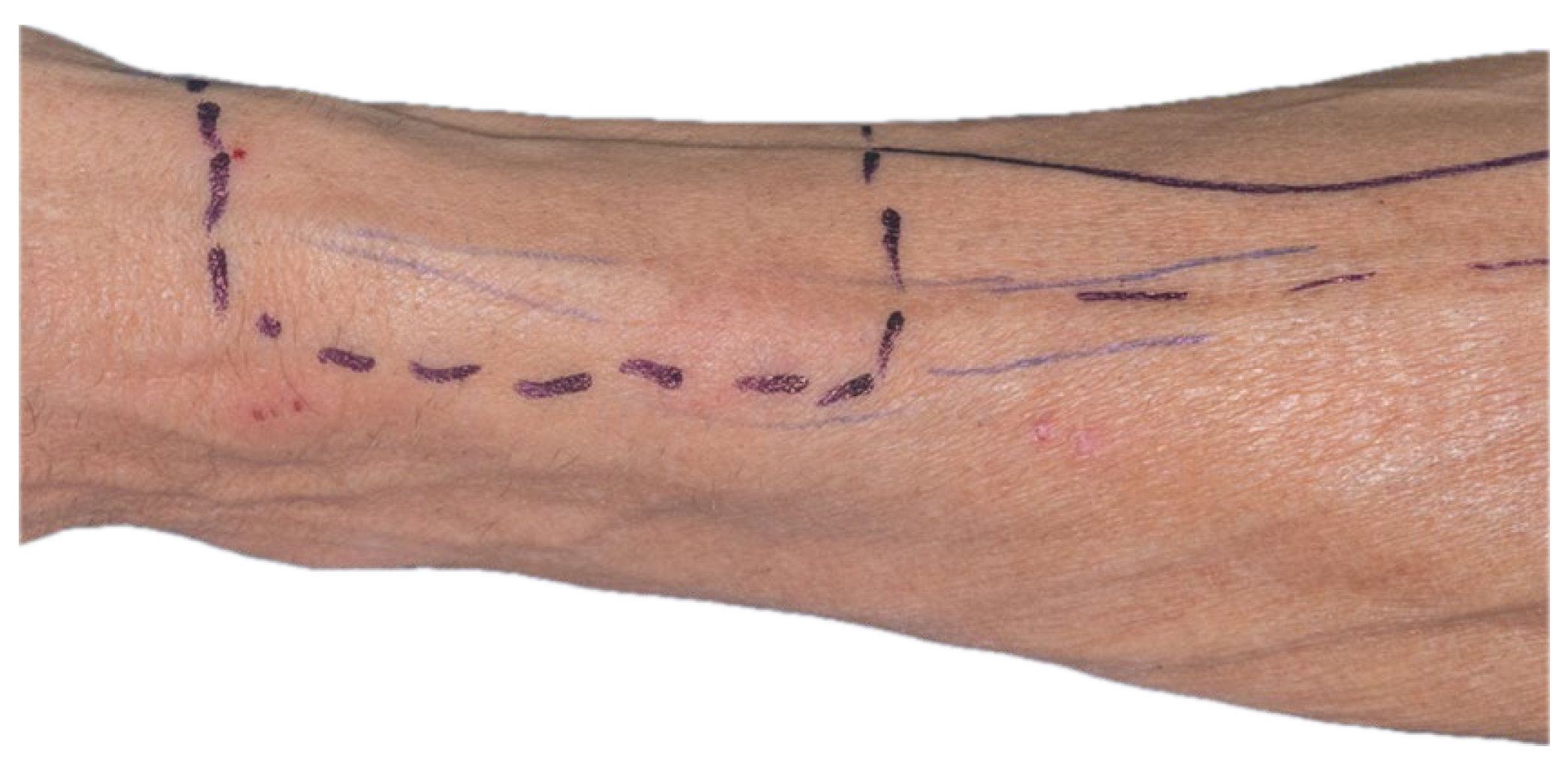 Flap dissection was initiated in the suprafascial plane at the ulnar margin, progressing until identification of the flexor carpi radialis tendon, due to the presence of the superficial branch of the radial nerve and lateral antecubital nerve, which lies in the suprafascial plane (