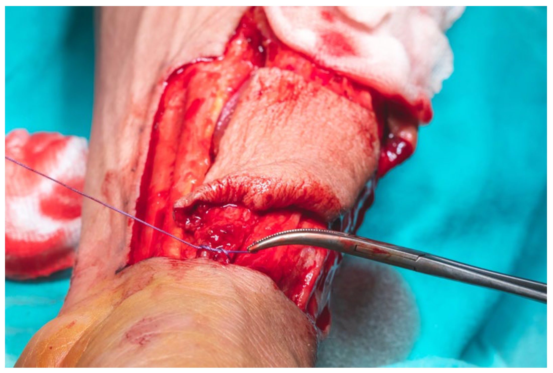 We performed all surgical procedures involving revascularization, reimplantation, or reconstruction with free flap transfer using a standardized microsurgical protocol. The arterial anastomosis was carried out first, followed by a waiting period of 5–10 min during which the flap is allowed to bleed. This step enables the assessment of blood flow restoration, confirmed by capillary refill and venous outflow from the flap (