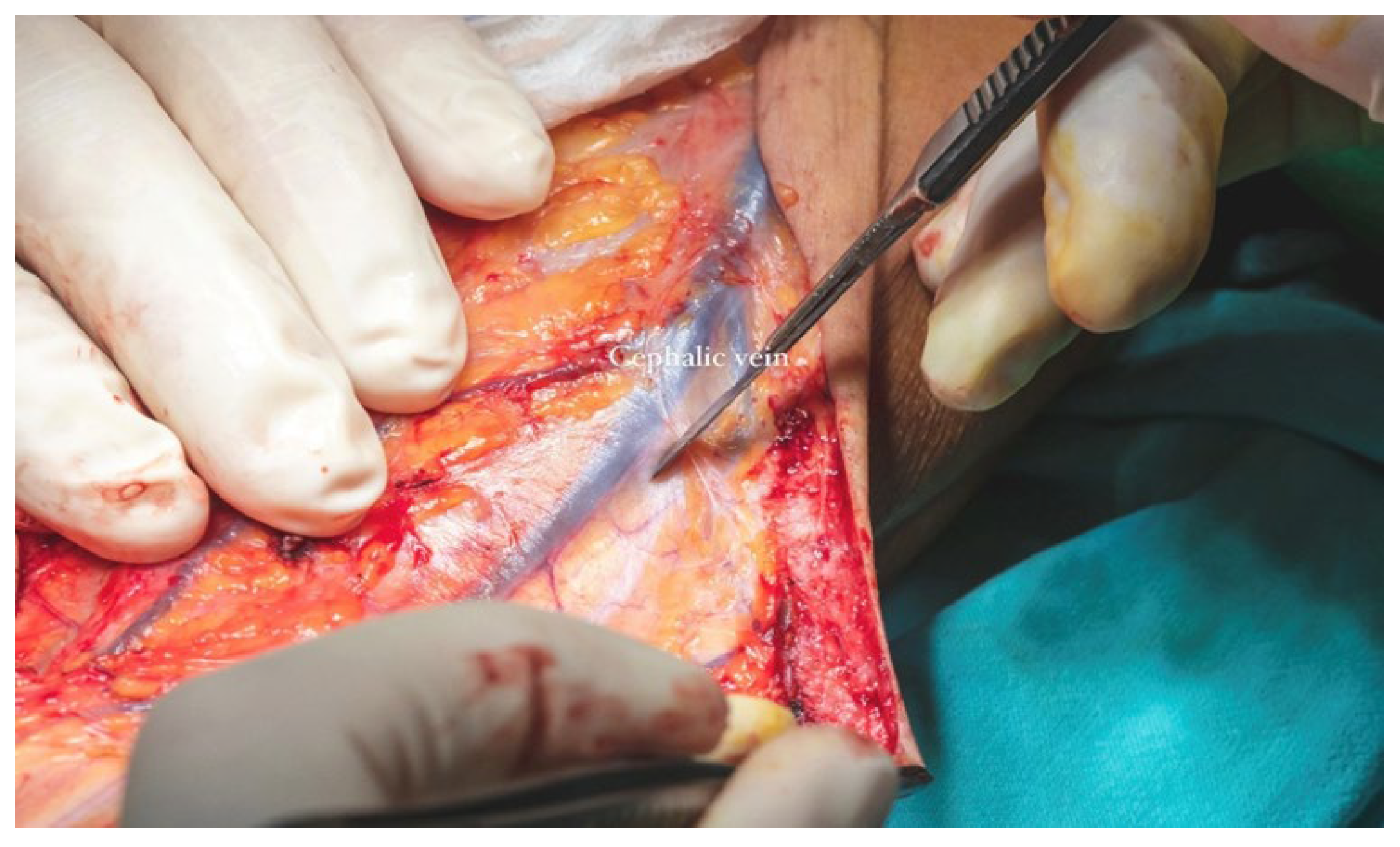 The cephalic vein was incorporated within the flap design and was therefore carefully dissected and ligated at the distal margin of the skin paddle. The S-shaped incision on the anterior aspect of the forearm extended proximally from the edge of the flap to the level of the elbow crease. In this region, dissection was performed in the suprafascial plane to preserve the integrity of the cephalic vein. The vein was meticulously mobilized, and its tributaries were ligated (