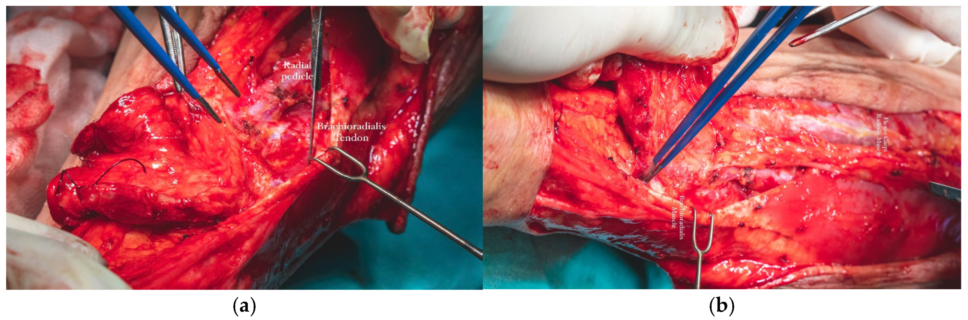 To avoid the risk of pedicle injury, the flap was dissected and harvested with a small amount of surrounding adipose tissue and a portion of the intermuscular septum containing the radial pedicle.