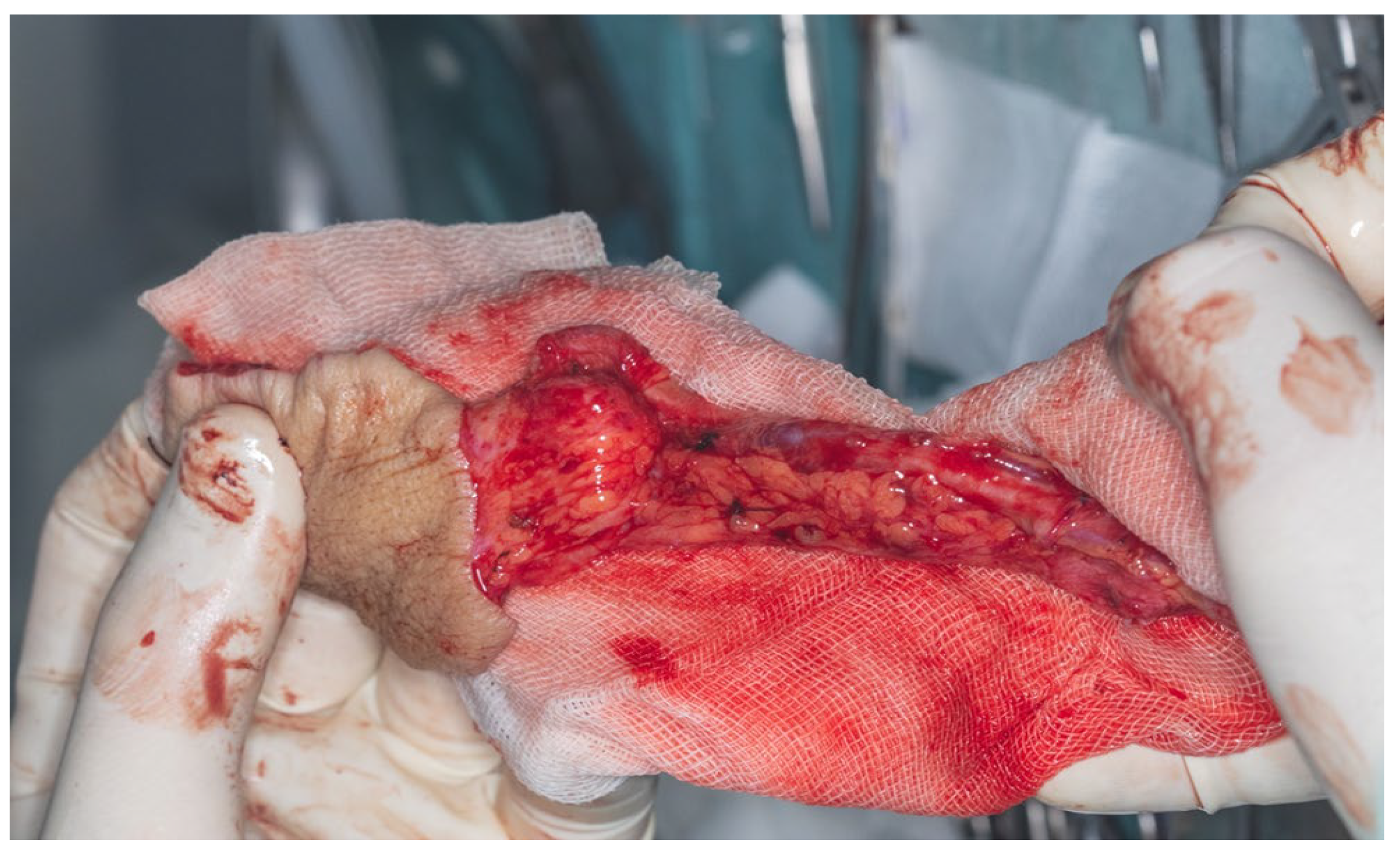 The size and contour of the flap were delineated intraoperatively using a sterile surgical marker, guided by the dimensions of the composite defect involving the floor of the mouth and lingual region, which measured approximately 8 × 5.5 cm. A vascular pedicle length of 13 cm was determined as necessary to facilitate tension-free tunneling and microvascular anastomoses within the cervical region (