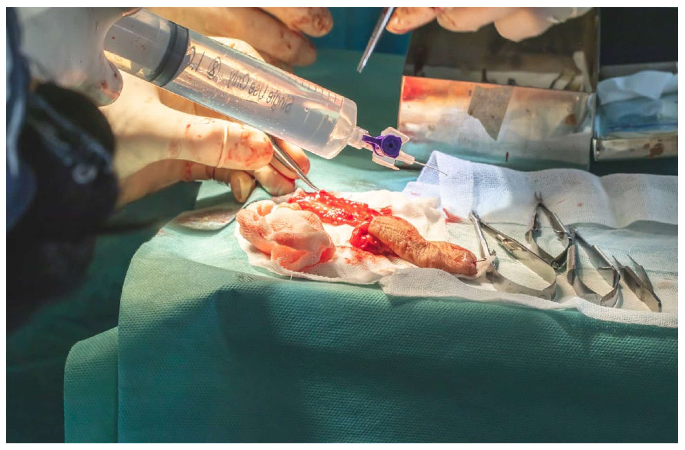 Arterial cannulation of the flap pedicle was performed using a 26-gauge cannula, through which a total of 50 mL of solution, comprising 45 mL of sterile normal saline and 5 mL (5000 IU) of fractionated heparin, was slowly irrigated. This intra-arterial flush ensured complete exsanguination of the flap, effectively minimizing the risk of intravascular coagulation during the ischemic interval prior to microvascular anastomosis (