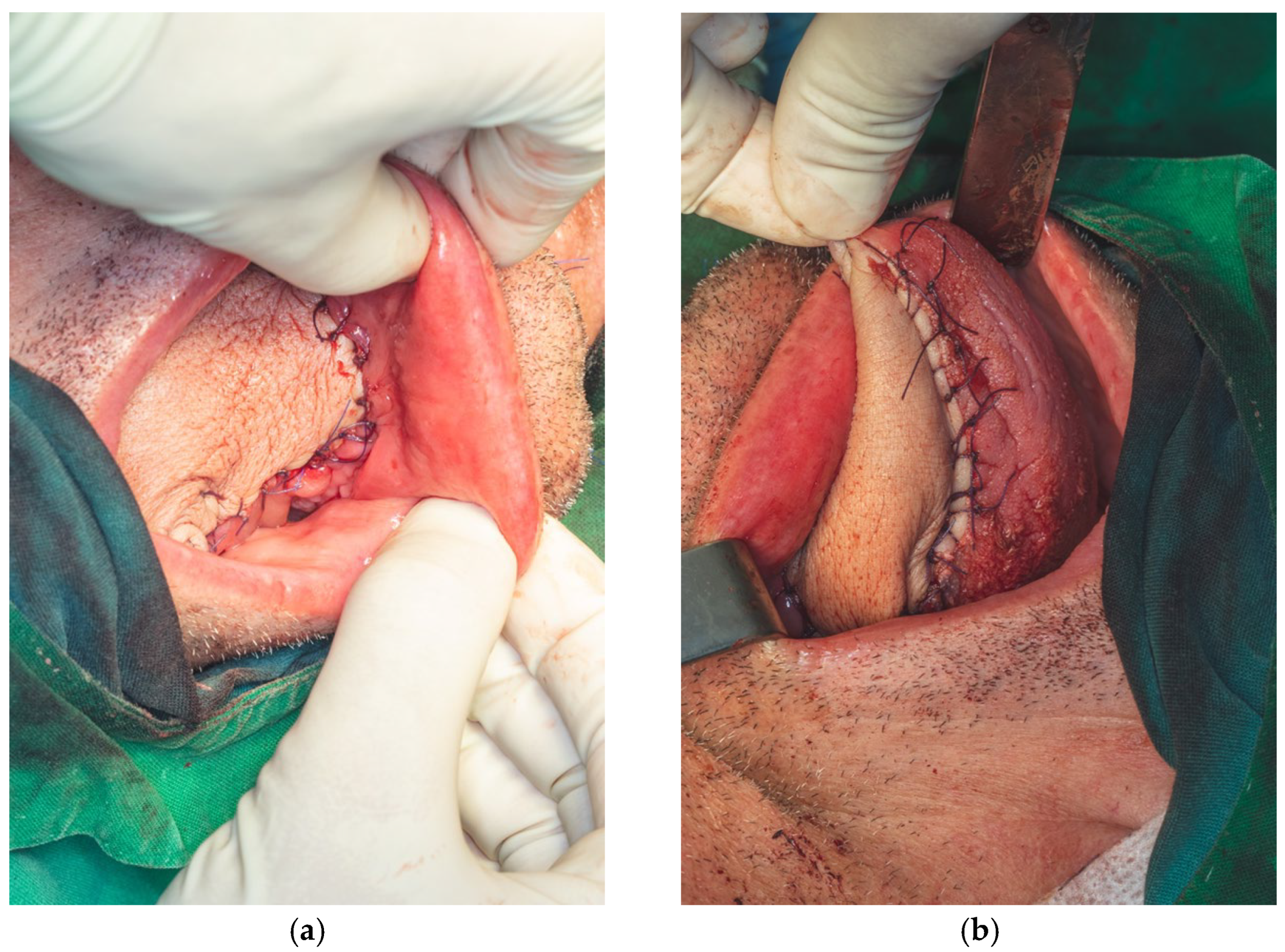 The flap was secured at the lingual apex using a single 3.0 slowly resorbable multifilament ligature to prevent accidental displacement or avulsion into the lateral cervical region, thereby minimizing the risk of contaminating the operative field with oral cavity flora, despite the fact that the entire oral cavity had been chemically prepped preoperatively with a 7.5% Betadine solution. Primary end-to-end anastomosis was performed under 3.5× magnification loupes using interrupted 8.0 and 9.0 polypropylene monofilament sutures with round-bodied needles.