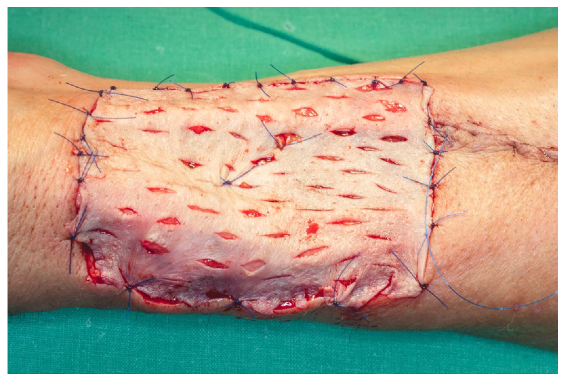 The cutaneous defect was resurfaced using a split-thickness skin graft (STSG), harvested with an electric dermatome from the anterolateral surface of the proximal third of the left thigh. The harvest site was selected to facilitate scar concealment. A medium-thickness graft was chosen, taking into account the relatively small surface area of the defect and the unavailability of a skin meshing device. Multiple drainage fenestrations were created in the graft using a No. 15 scalpel blade to permit egress of wound exudate and prevent hematoma formation beneath the graft, which could otherwise compromise graft viability. The graft was secured in place using 5.0 monofilament polypropylene sutures, and a tie-over dressing was applied to ensure even pressure distribution and optimal adherence of the graft to the wound bed (