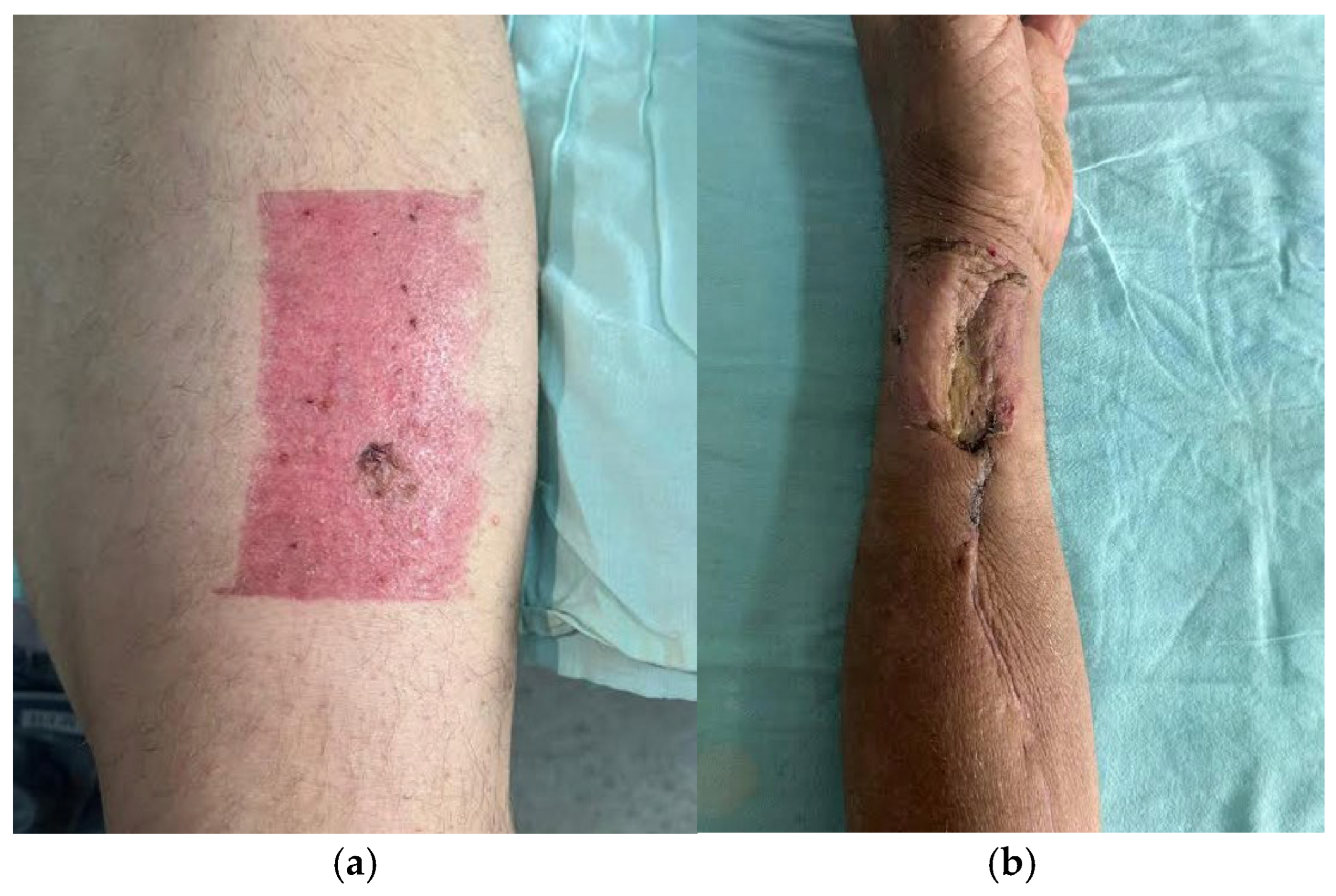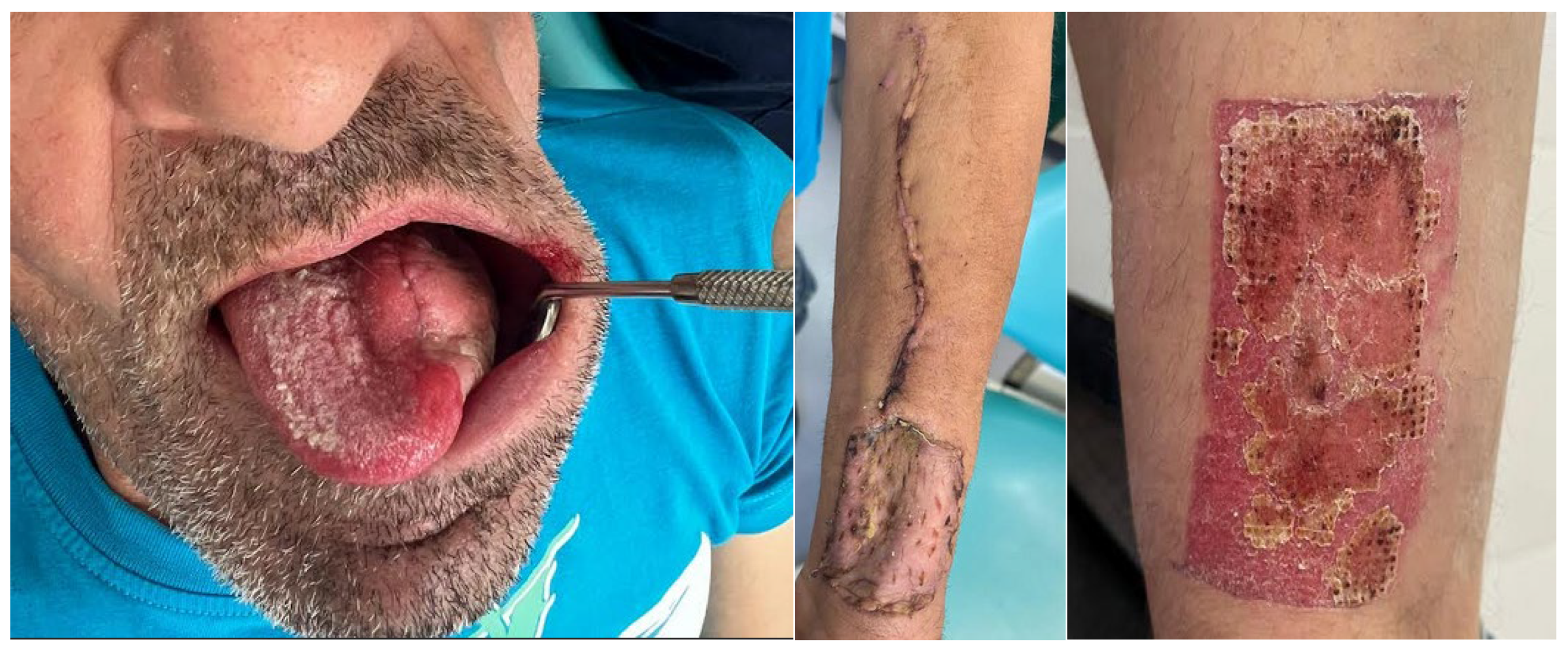 Oral candidiasis was diagnosed and successfully treated during hospitalization. The patient also reported a painful, electric shock-like tactile sensitivity at the flap donor site, attributed to incomplete coverage of the radial nerve by the overlying skin graft.