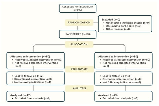 - Hopewell, S.; Chan, A.-W.; Collins, G.S.; Hróbjartsson, A.; Moher, D.; Schulz, K.F.; Tunn, R.; Aggarwal, R.; Berkwits, M.; Berlin, J.A.; et al. CONSORT 2025 Statement: Updated Guideline for Reporting Randomised Trials. BMJ 2025, 389, e081123. [Google Scholar] [CrossRef]