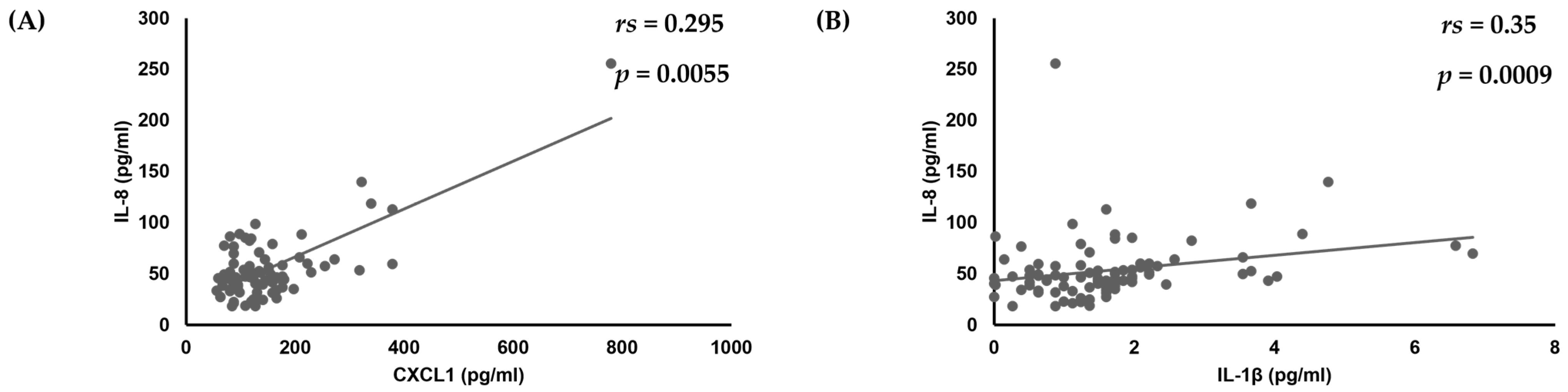 | IL-8 | 0.35 | 0.0009 *** | 0.055 | 0.614 | 0.295 | 0.0055 ** | ||||