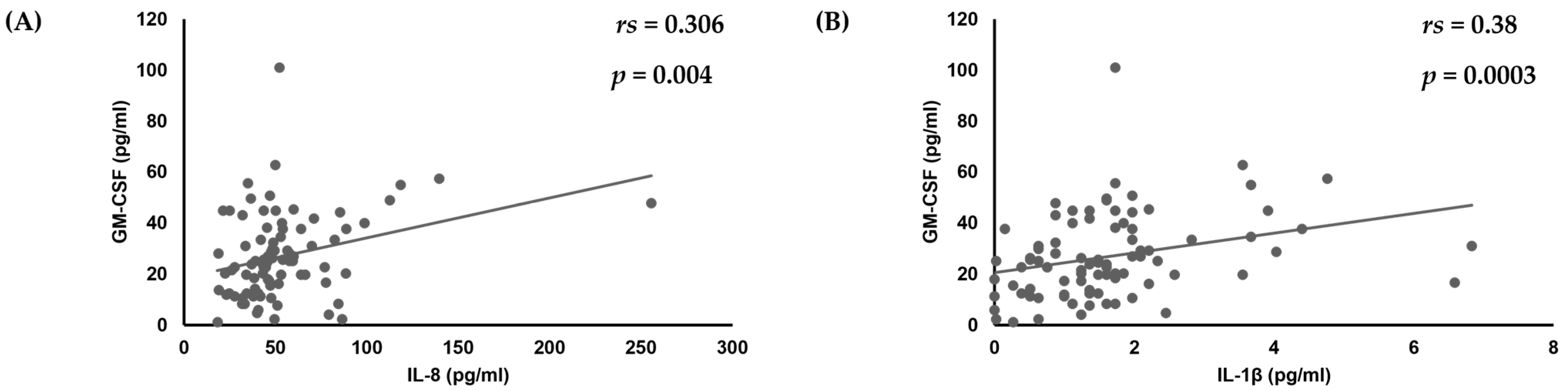| GM-CSF | 0.039 | 0.722 | −0.023 | 0.834 | 0.179 | 0.098 |