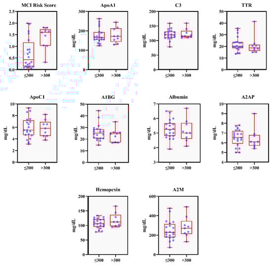 The dataset includes blood sample analysis, such as inflammation-related markers (Interleukin-6 (IL-6), C-Reactive Protein (CRP), and Tumor Necrosis Factor-α (TNF-α)) and MCI risk through protein plasma analysis. The proteins involved in the analysis are the Amyloid-β sequester proteins (Apolipoprotein A1 (ApoA1), Complement C3, and Transthyretin (TTR)), the nutrition-related proteins (Albumin), lipid metabolism protein (Apolipoprotein C1 (ApoC1)), innate immunity and inflammation (Alpha-1-B-Glycoprotein (A1BG)), and coagulation-fibrinolytic protein (Alpha-2-Macroglobulin (A2M), Alpha-2-Anti Plasmin (A2AP), and Hemopexin (HPX)) [15,16]. The MCI risk score ranged from 0.00–0.50 (“No risk”), 0.51–1.00 (“Low risk”), 1.01–1.50 (“At risk”), and 1.51–2.00 (“High risk”) (MCI Screening Test Plus, MCBI Co, Ltd.,Tokyo, Japan) [17]. However, due to the limited number of patients, this study used only two ranges of score groups to categorize MCI risk: 0.00–1.00 (“No risk to low risk” of MCI) and 1.01–2.00 (“At risk to high risk” of MCI).
