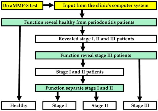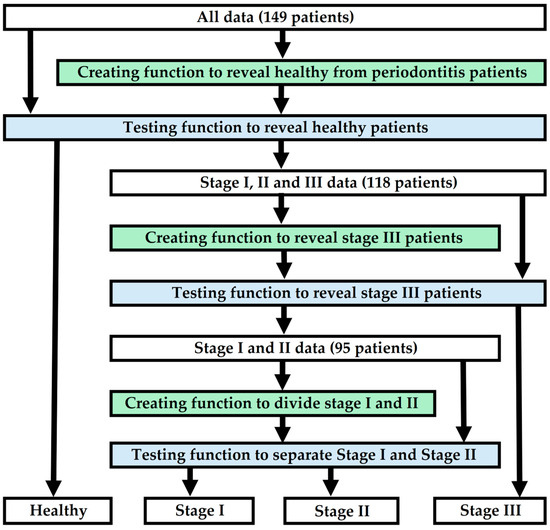 All patients included in this study were classified based on the 2018 classification of periodontal diseases [,,]. In the separation of the sample data, the status of different periodontitis patients was treated as a binary variable. When healthy patients were to be differentiated into their own group, patients suffering from periodontitis were marked with the binary value one, while patients with no evidence of periodontitis were marked with the value zero. The same binary principle was also applied to distinguish, for example, stage I and stage II patients from each other.