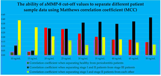 The yellow bars in Figure 2 illustrate how aMMP-8 cut-off values can be used to separate stage I and stage II patients. The bar graph indicates that the cut-off values of 10 and 15 ng/mL depict the highest bars, and these were examined as the main predictive factors in this scenario. The change in the heights of the yellow bars is opposite compared to the bars colored black. This seems logical because the yellow bars represent a group of patients which have less severe periodontitis than the patients in the case of black colored bars. The stage of periodontitis is associated with the concentration of aMMP-8 in mouth rinse [].