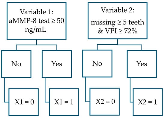 X1 = aMMP-8 test ≥ 20 ng/mL or a tobacco smoker or missing ≥8 teeth [No.] (yes = 1, no = 0; patient boundary conditions are: aMMP-8 concentration in mouth rinse ≥ 5 ng/mL and ≤85 ng/mL, 15 ≤ teeth number present ≤ 28).