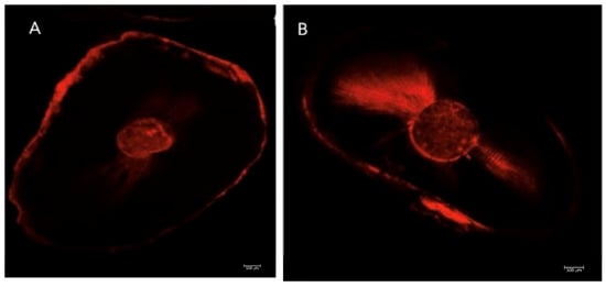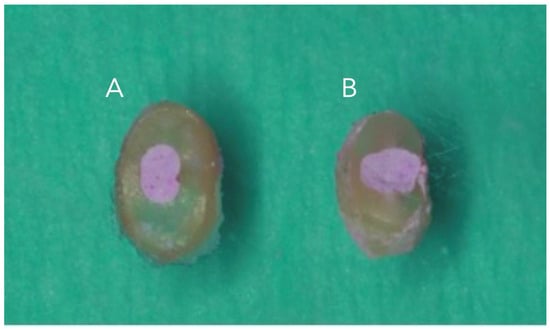 Representative image, scale 500 µm2; (A): lid technique and (B): conventional technique.