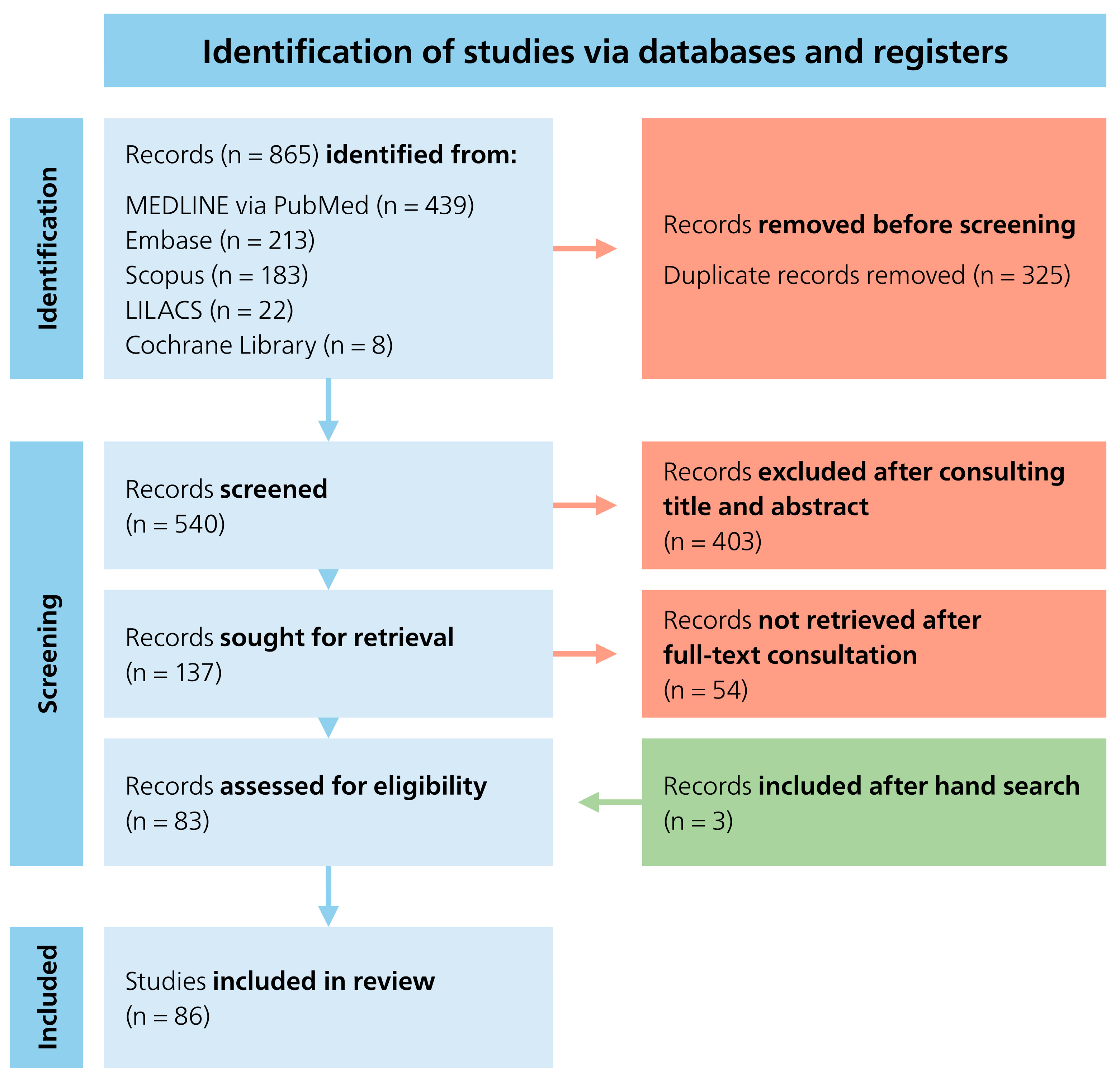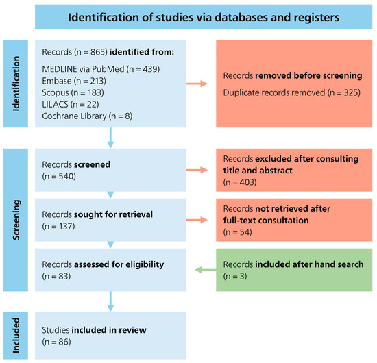 The literature search in the five databases (MEDLINE via PubMed, Embase, Scopus, LILACS and Cochrane Database) yielded a total of 865 articles. After the duplicates were removed, 540 articles remained, which were checked for inclusion and exclusion criteria based on the title and abstract. In this process, 403 articles were excluded because they did not fit the topic. The remaining 137 articles that fulfilled the inclusion criteria were reviewed in full text. After analyzing the full-text articles and handsearching, three additional articles were added. Thus, a total of 86 articles were included in this systematic review (Figure 1).
