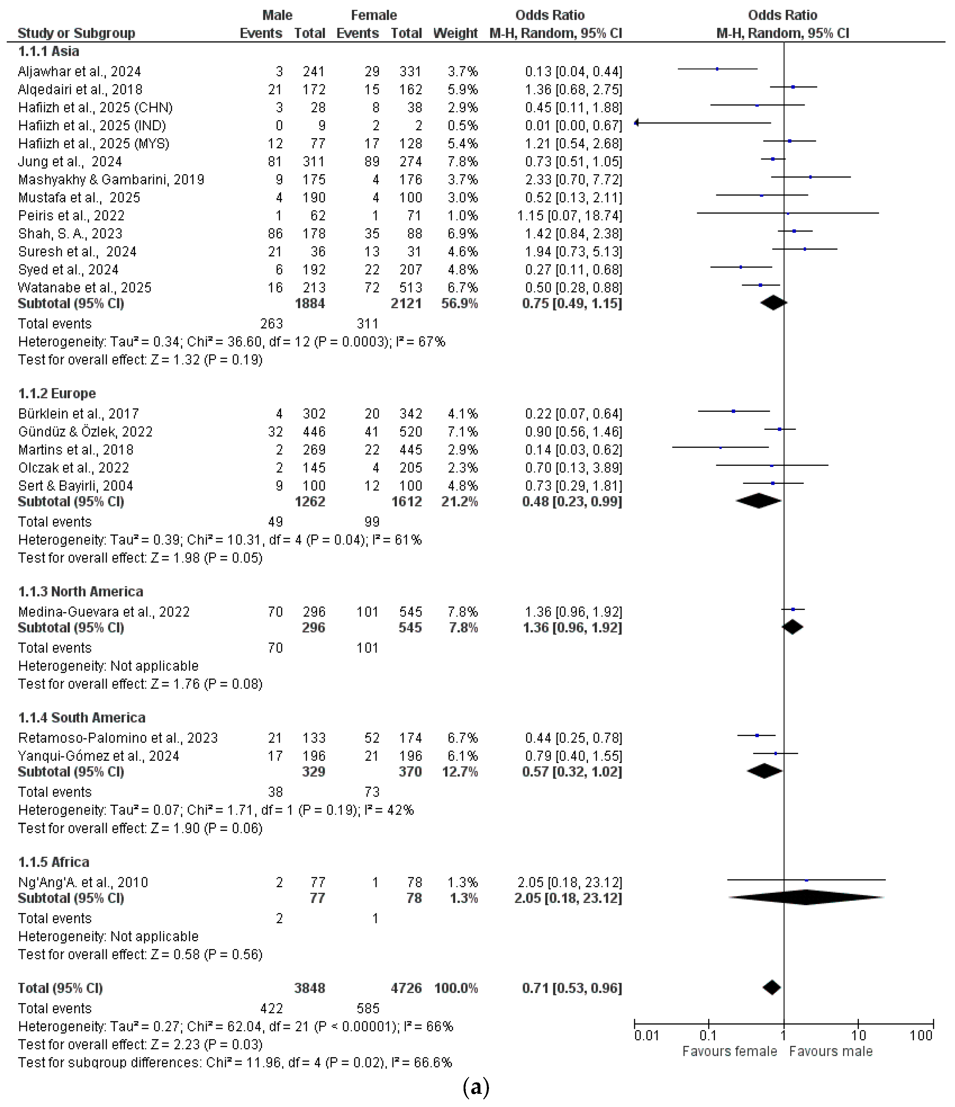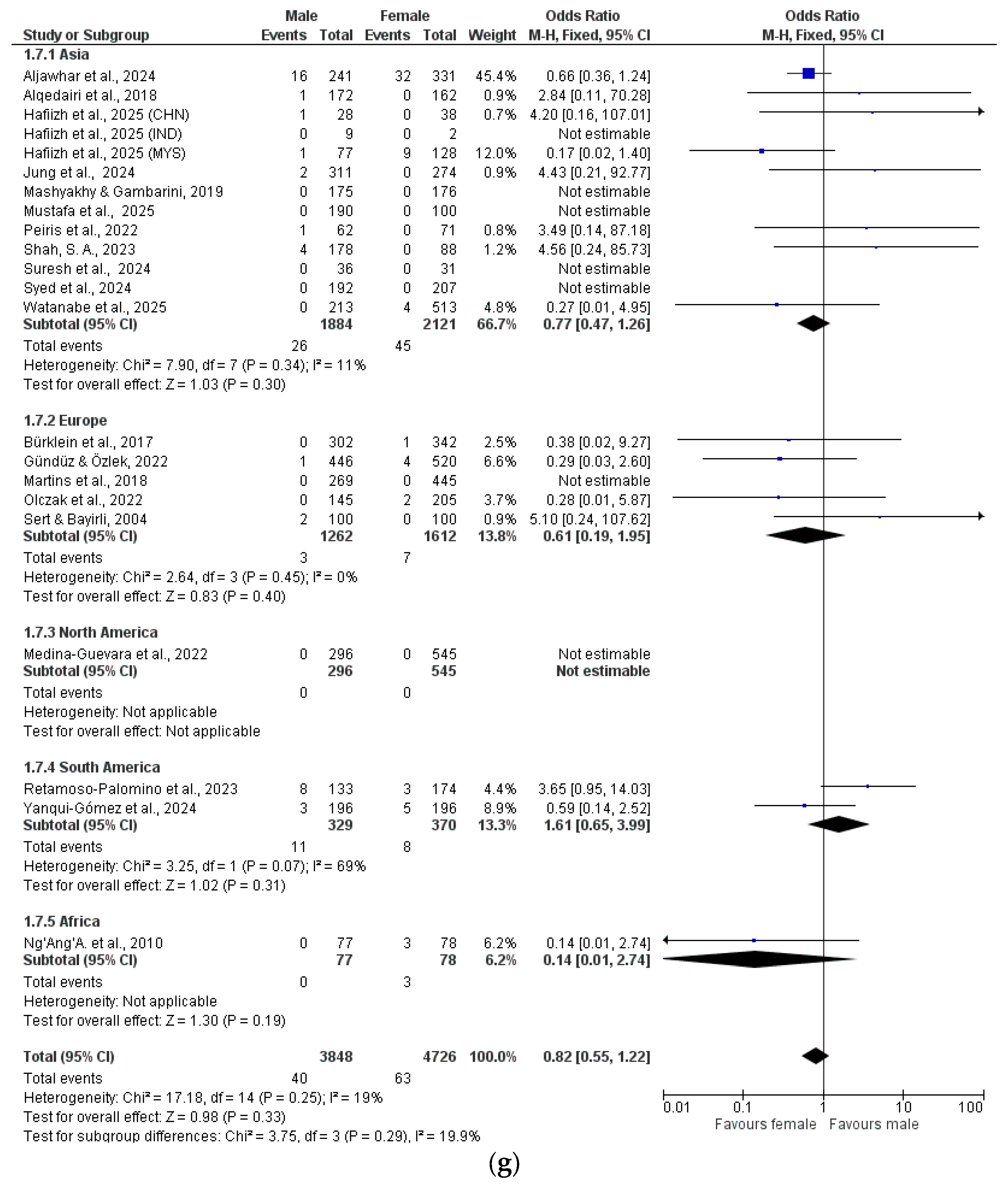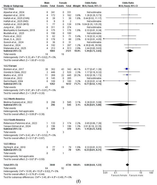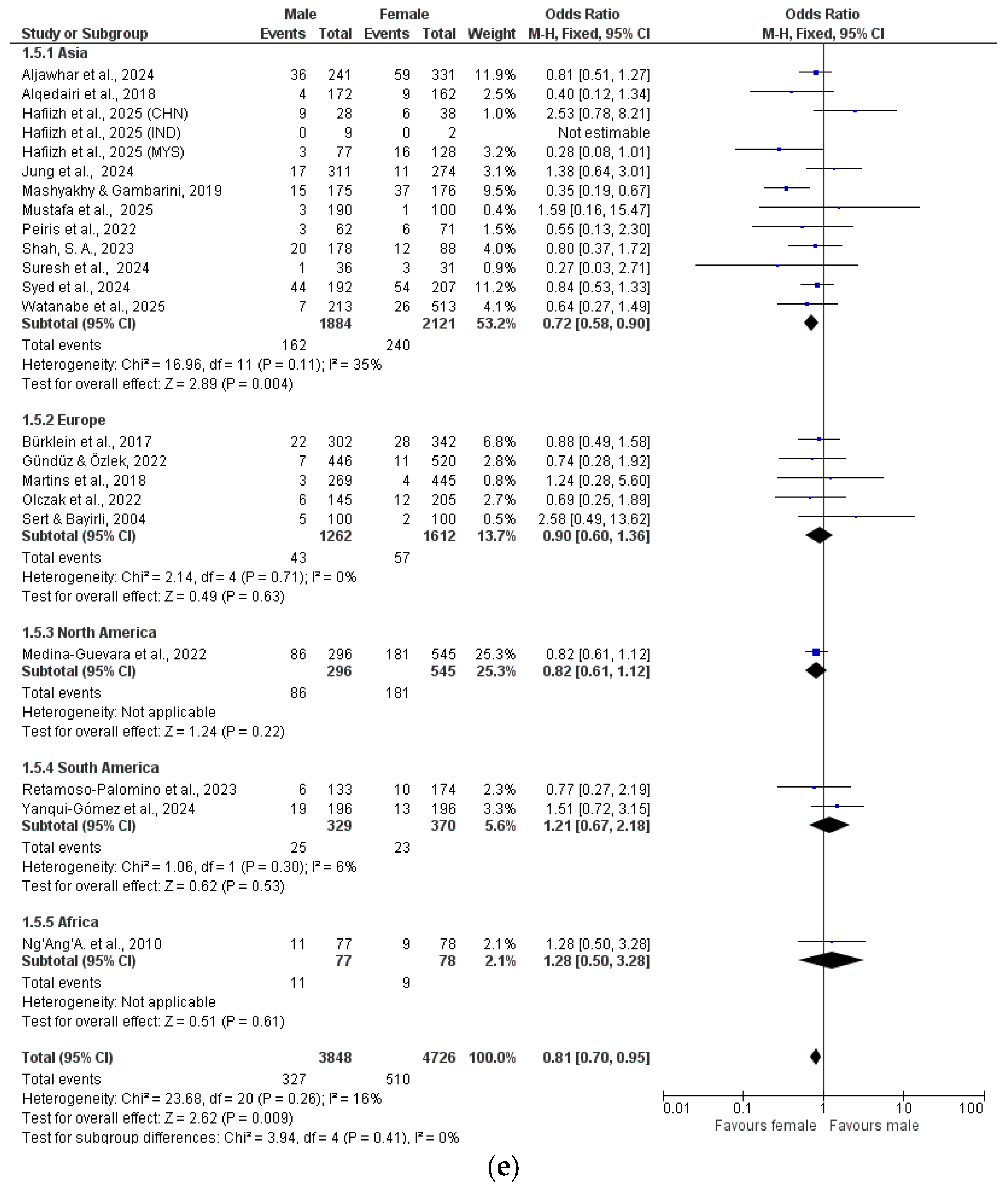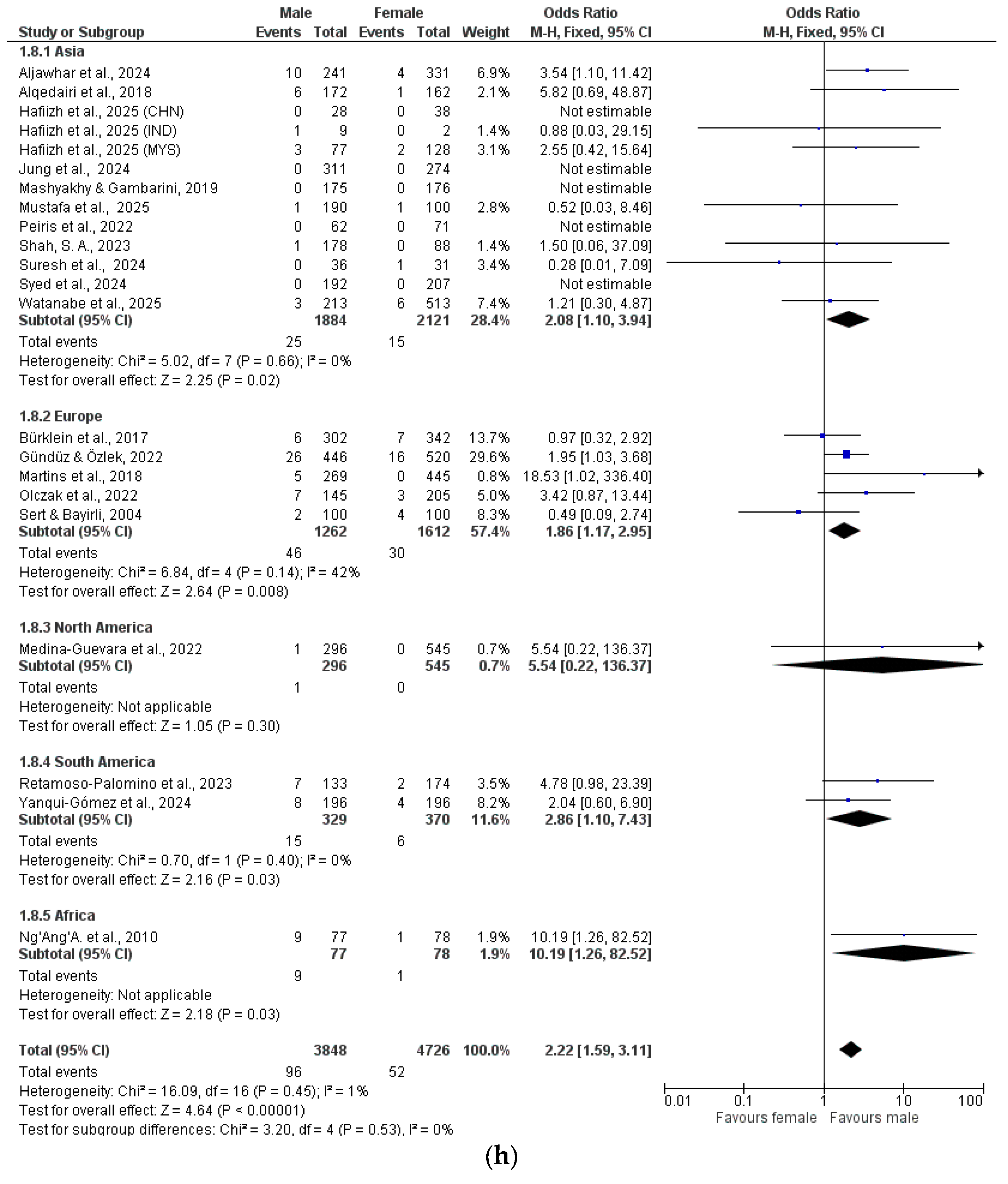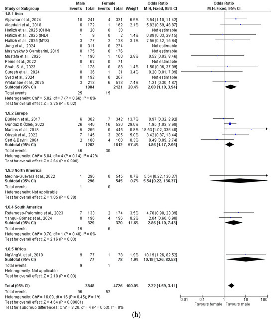 The data were analyzed by meta-analysis and grouped by geographical location (Asia, Europe, North America, South America, Africa) (Figure 2a–h).