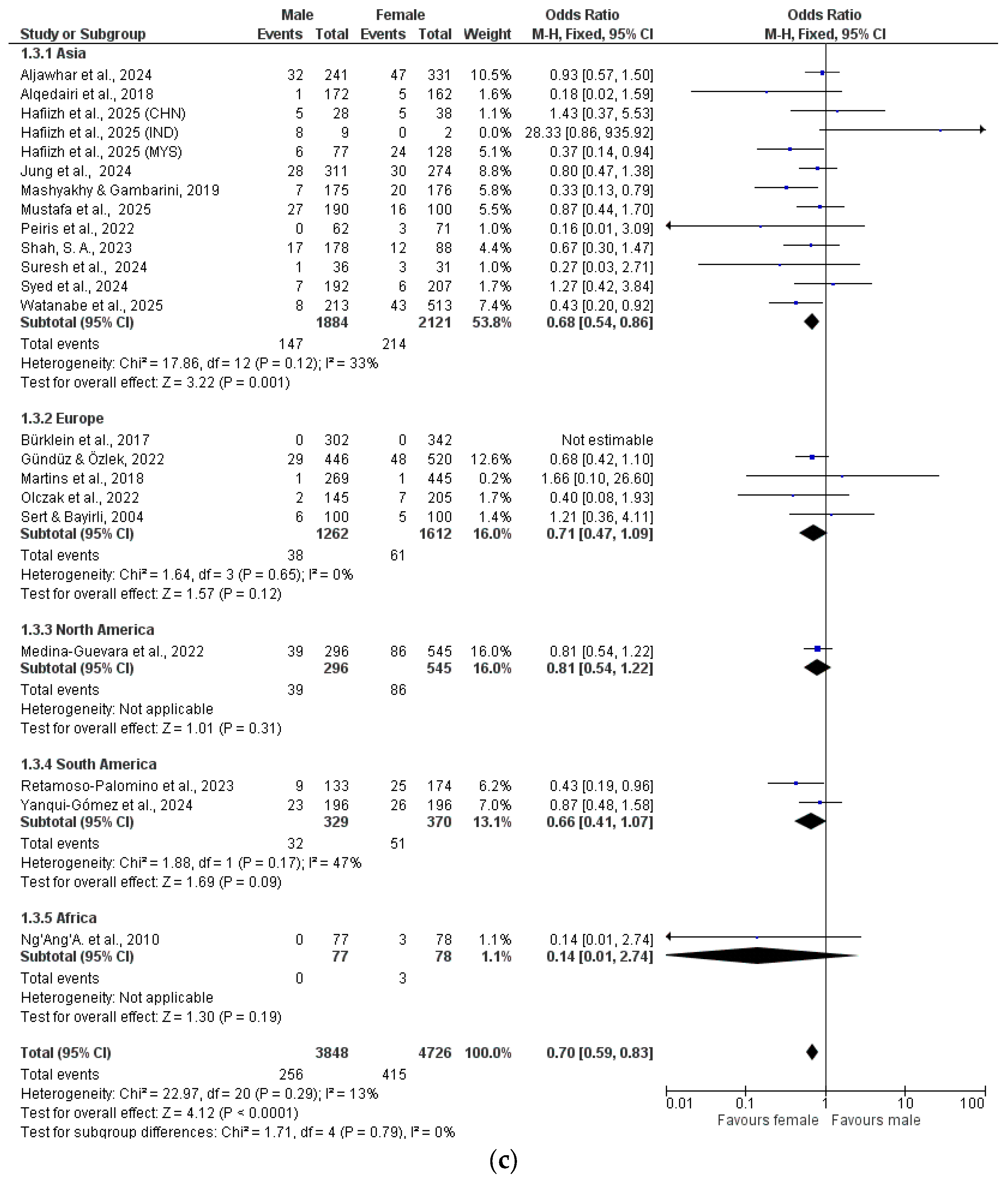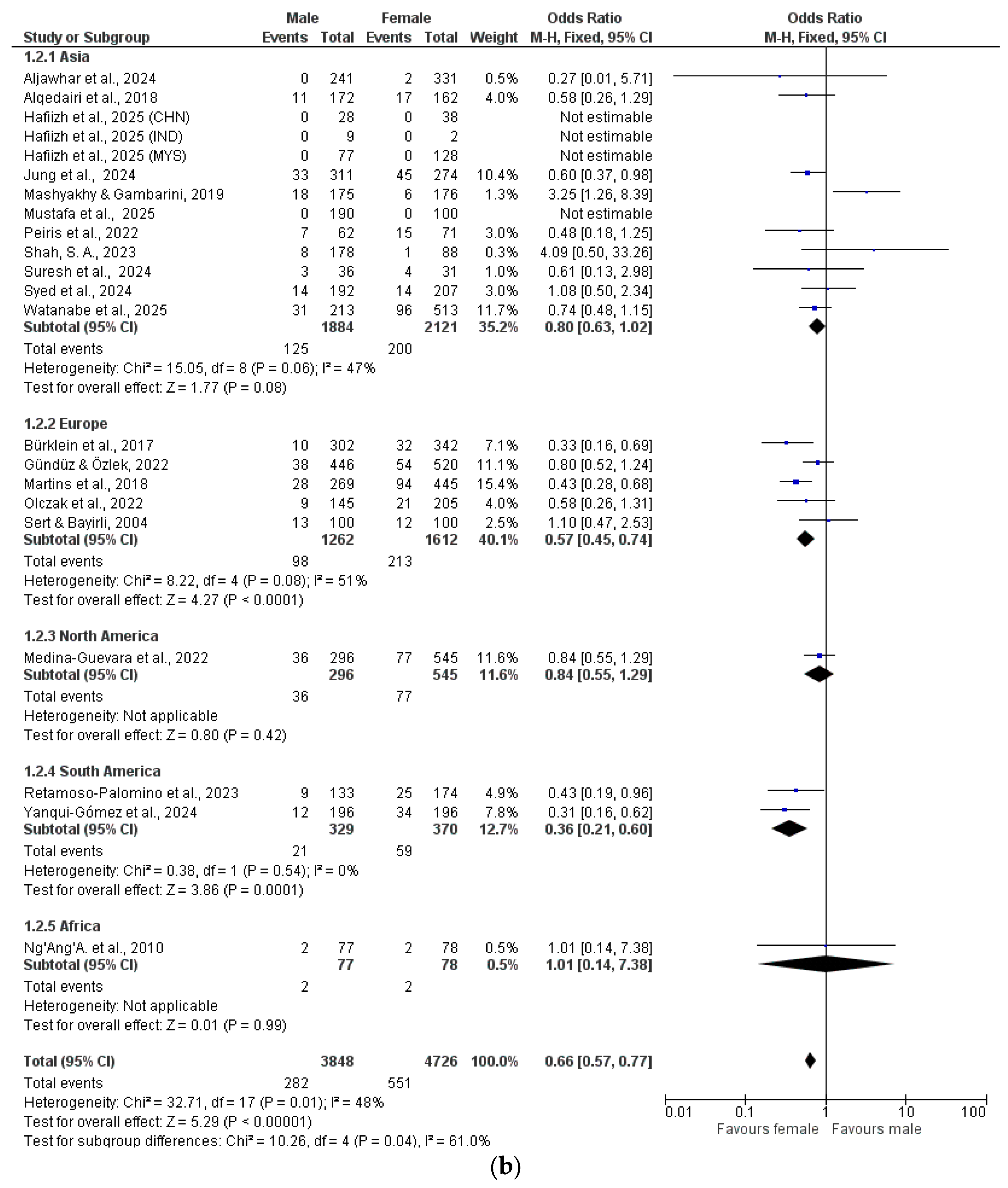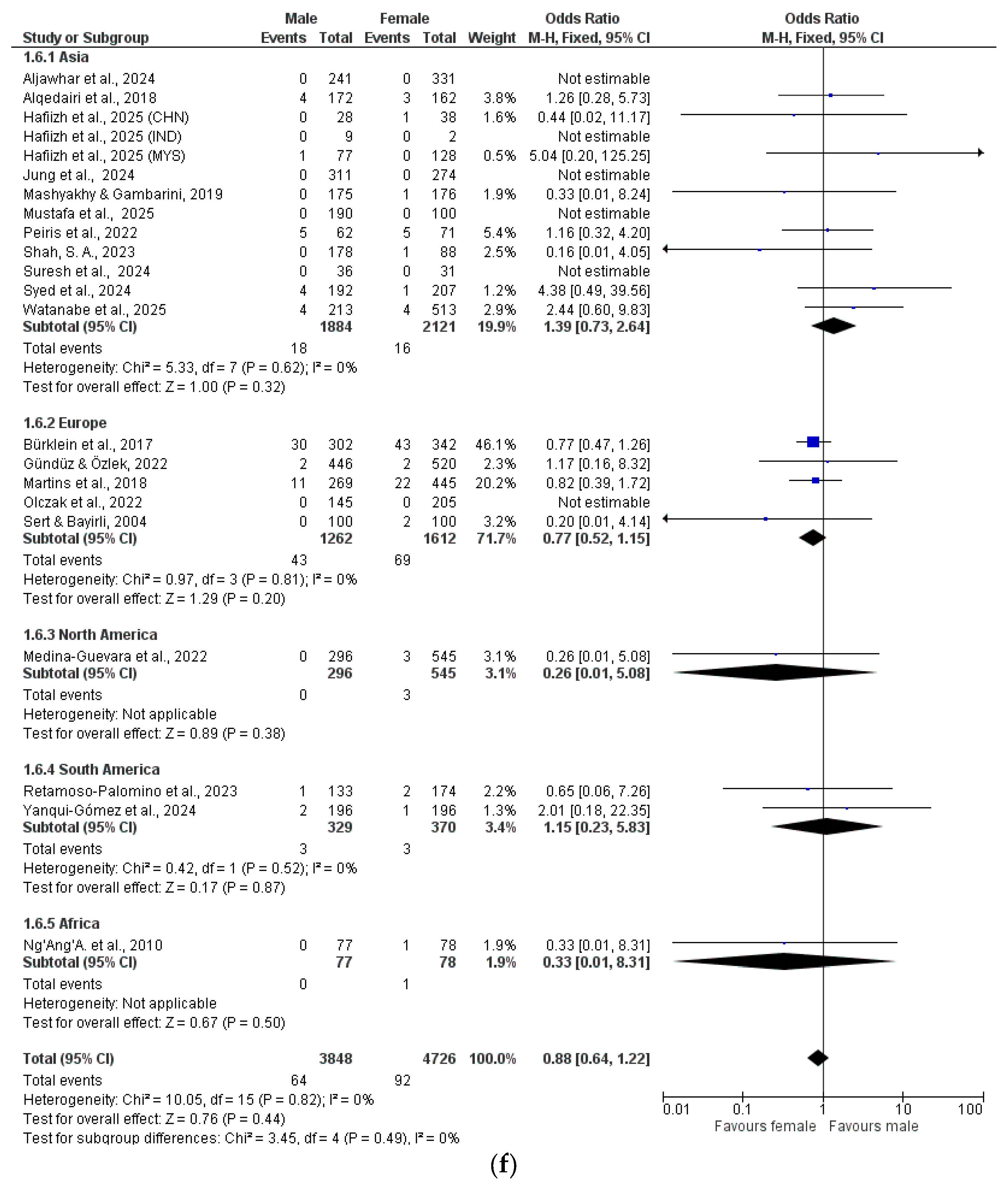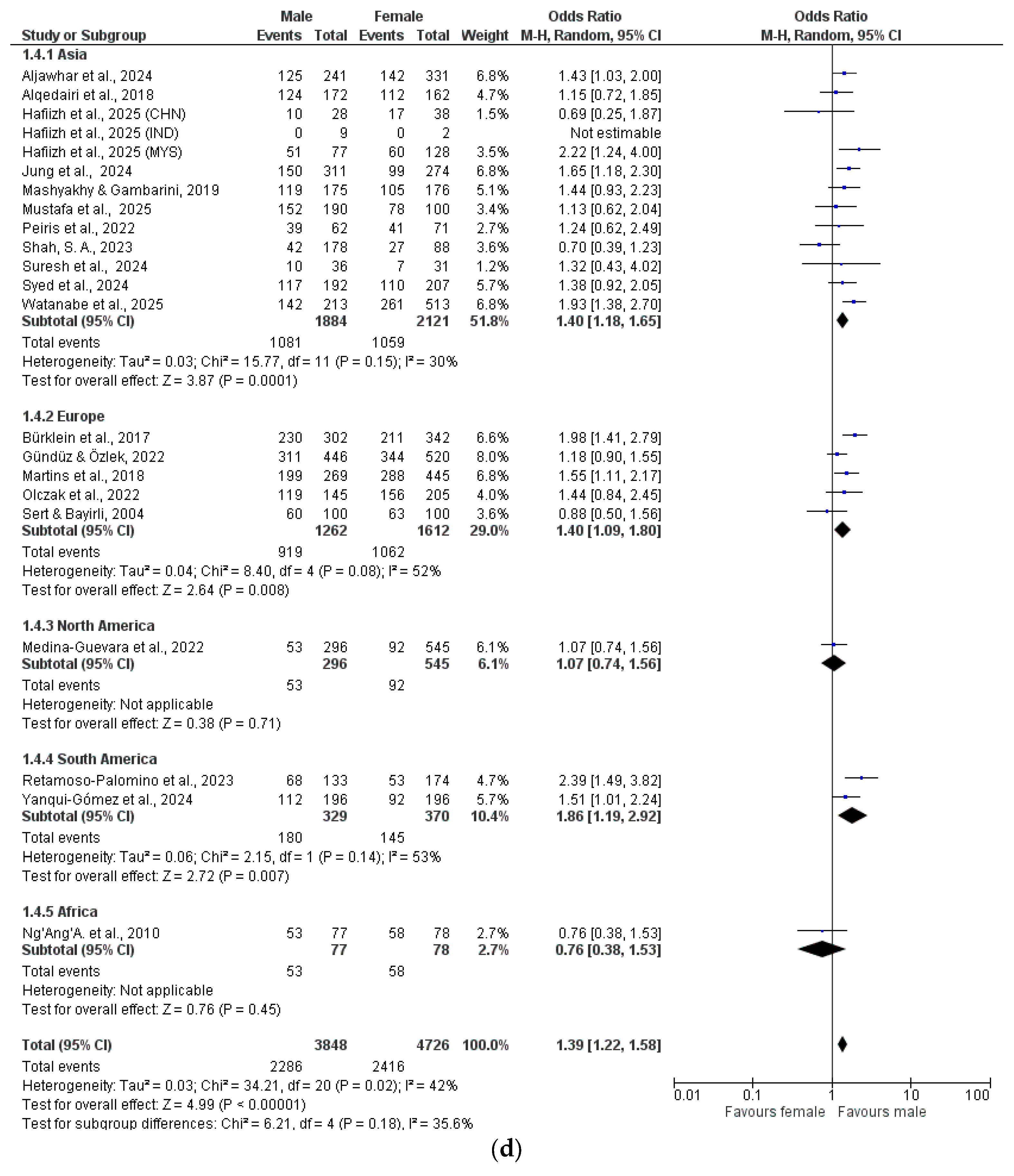 The data were analyzed by meta-analysis and grouped by geographical location (Asia, Europe, North America, South America, Africa) (Figure 2a–h).