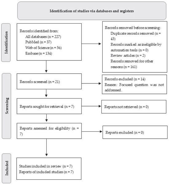 A total of 227 records were identified through database searches across multiple searches (Supplementary Table S1). After removing four duplicate records and two review articles, 182 studies were further screened. Of these, 175 were marked ineligible as they did not address the focused research question. Seven studies [12,15,16,17,20,22,23] performed on animal models were included and processed for data extraction (Figure 1).