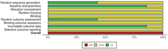 The risk of bias (RoB) was assessed using the Systematic Review Centre for Laboratory animal Experimentation (SYRCLE) tool [25]. Each study was assessed using the following ten domains: (a) sequence generation; (b) baseline characteristics; (c) allocation concealment; (d) random housing; (e) blinding of investigators; (f) random outcome assessment (AC); (g) blinding of outcome assessor; (h) incomplete outcome data; (i) selective outcome reporting; and (j) other sources of bias. Each of the above domains was rated as “low risk”, “high risk”, “critical risk” or “unclear risk” based on the information provided in the study. The RoB within each study was individually appraised by two authors (MLR and FJ). Disagreements were settled via discussion and consultation with a third author (PER).
