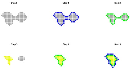 Example of the layer removal–reconstruction procedure. Step 0 shows the detection of two surfaces connected by a channel that does not belong to the segmented region. Steps 1 and 2 illustrate the removal of the two outermost layers. Step 3 shows the selection of the surface of interest. Steps 4 and 5 correspond to the layer reconstruction process. After completion, the connection between the two surfaces has been removed.