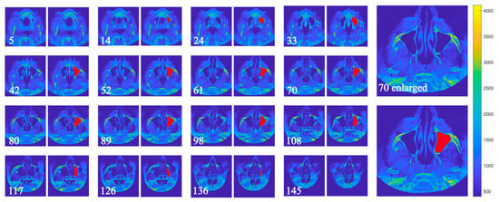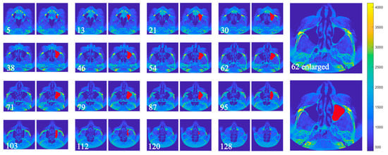 Figure 5 and Figure 6 illustrate the segmentation of the maxillary sinus before and after surgery using the proposed algorithm. The segmented area was closely aligned with the actual sinus boundaries, and segmentation accuracy was validated by an expert. The examples correspond to Patient 2, Sample 3, left side. Non-consecutive slices were intentionally selected to provide a clearer visualization of the algorithm’s processing steps and the resulting segmentation. Additionally, one image on the right side is displayed at a larger scale to highlight the segmented region in greater detail.