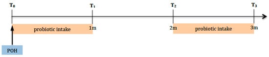 Timeline showing the four time points. T0: Baseline; POH: professional oral hygiene session and probiotic intake was started; T1: after 1 month, probiotic intake was suspended; T2: after 2 months, probiotic intake was continued; T3: after 3 months, the trial ended.