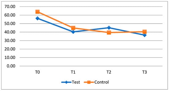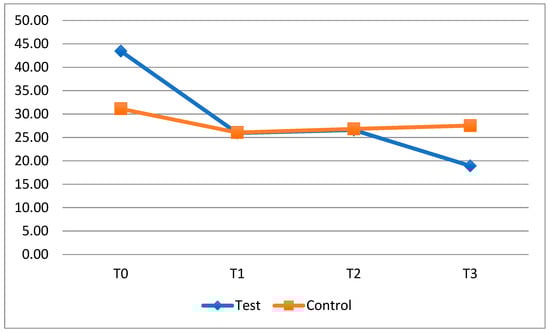 The data collected showed that the average FMPS improved at every timestep in both groups (Figure 2), especially for the test group, where there was an improvement between T0 and T1 (from 56.20 ± 27.70 to 40.27 ± 26.90) and between T2 and T3 (from 45.13 ± 24.60 to 36.47 ± 23.90), i.e., the periods when the probiotic was taken, but not between T1 and T2, the period of non-intake, in which there was a slight worsening of the plaque index (from 40.27 ± 26.90 to 45.13 ± 24.60).