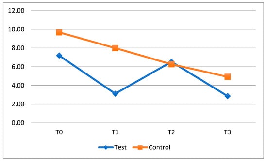 Regarding the bleeding index, the statistical analysis performed showed no statistically significant differences. However, data analysis showed a progressive improvement in FMBS at all timesteps in the test group (Figure 5), especially at T3, while patients in the control group experienced a smaller improvement and, at T3, displayed an increase in gum bleeding (Test: 2.60 ± 2.75; control: 4.35 ± 4.97; p = 0.243) (Table 7).