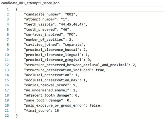 Each 3D model was linked to a corresponding metadata file in JSON format, which stored the detailed rubric scores assigned to each case. An example of a JSON file with rubric scores is shown in Figure 3. Conversational AI provided Python code to generate these JSON files and populate them with the appropriate values, including per criterion scores and total marks. Scripts ensured each point cloud matched its JSON label file. This pairing enabled the training of a supervised learning model in which the AI would learn to predict rubric-based scores from the 3D geometry of the preparation.
