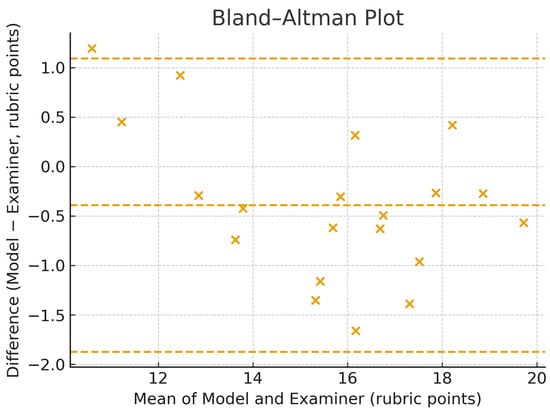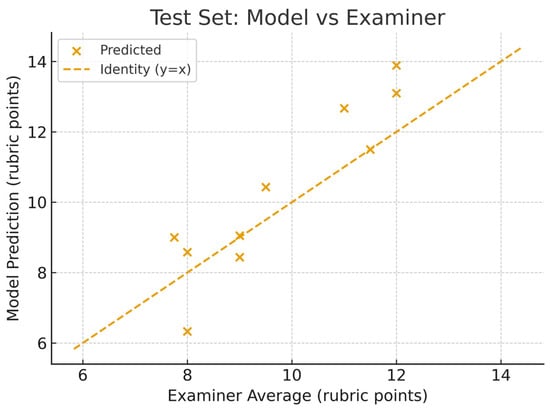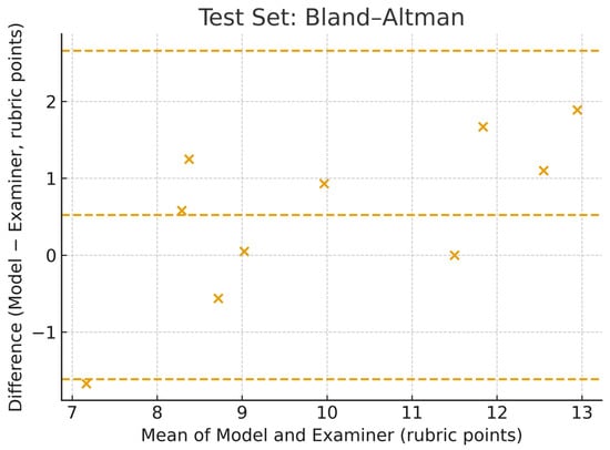 On the testing set, the model achieved a mean absolute error (MAE) of 0.97, a root mean squared error (RMSE) of 1.16, and a Pearson correlation coefficient (r) of 0.92, indicating a strong linear relationship with the expert examiner scores. In addition to Pearson’s r, we report complementary agreement statistics on the 10-case test set. Spearman’s rank correlation was ρ = 0.875, and Lin’s concordance correlation was ρc = 0.839, with an accuracy component Cb = 0.911, indicating the degree of absolute agreement relative to the 45° identity line. A Bland–Altman analysis showed a mean bias of +0.52 rubric points, with 95 percent limits of agreement from −1.61 to +2.66 rubric points. The model prediction vs. the examiner average scores for the testing dataset are shown in Figure 8, while the Bland–Altman plot for the testing dataset is shown in Figure 9.