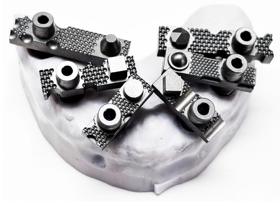 Scan-body design is a well-recognised determinant of intraoral-scanner accuracy [35,36,37,38,39]. In this study, a system of irregular, multi-geometry titanium scan bodies was used to optimise scan capture within an AI-assisted real-time library-matching protocol. The scan bodies feature horizontally aligned centroids and distinctive, non-repetitive surface geometries intended to improve digital recognition and reduce angular distortion between implants.