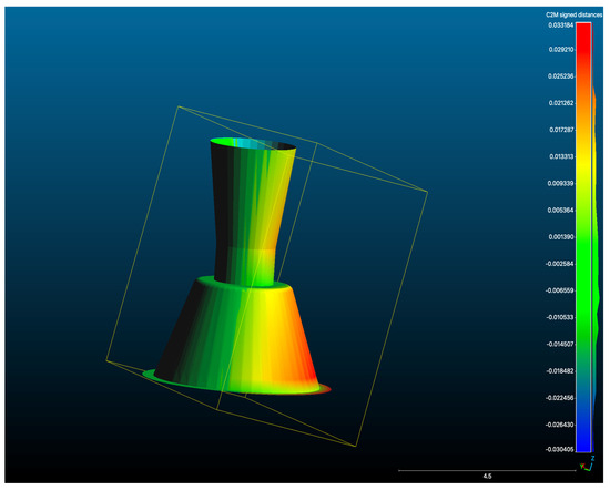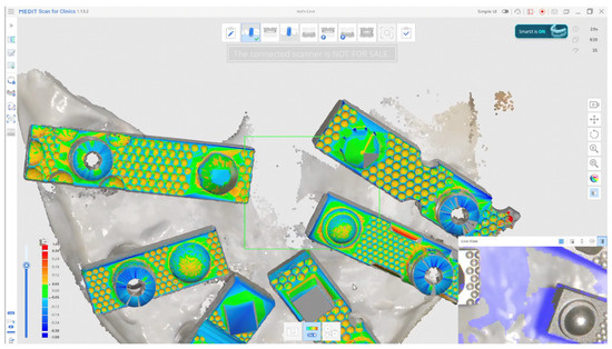 A total of 20 independent full-arch scans were obtained under identical environmental and hardware conditions by a single experienced operator. During acquisition, the system’s real-time library matching algorithm automatically replaced the physical scan body geometries with corresponding virtual Multi-Unit Abutments (MUAs) within the software environment. Once all scans were completed, the scans were aligned using a best fit match in cloud compare as seen in Figure 4.