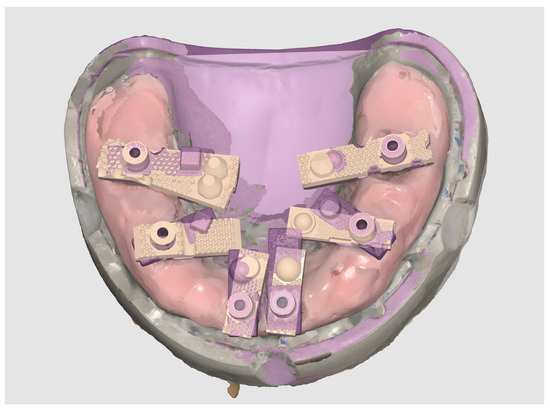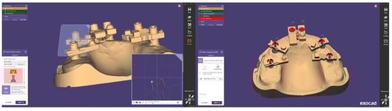 Each finalised dataset was exported in STL format and processed using Exocad DentalCAD (Exocad GmbH, Darmstadt, Germany). Within Exocad, the six virtual MUAs were digitally isolated and exported as individual files, generating a total of 120 implant-specific STL datasets (20 per site). Figure 5 shows the process of aligning the scan body implant library components in Exocad for the generation of position-specific datasets.