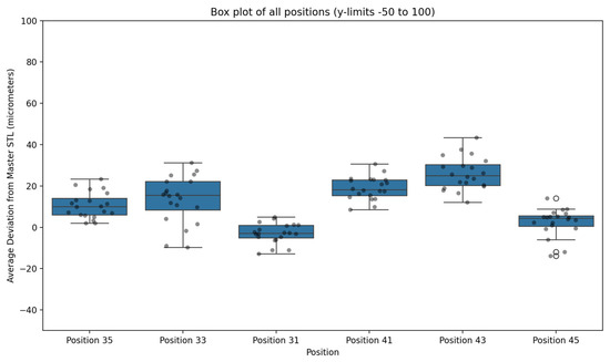 At the individual implant level, the lowest mean deviations were observed at position 31 (4.95 ± 3.17 μm; range 0.85–12.77 μm) and position 45 (5.96 ± 3.64 μm; range 0.77–14.07 μm). The highest mean deviation occurred at position 43 (26.15 ± 8.68 μm; range 12.10–43.46 μm). Although posterior sites exhibited slightly greater variability than anterior sites, no mean deviation exceeded 30 μm at any position.