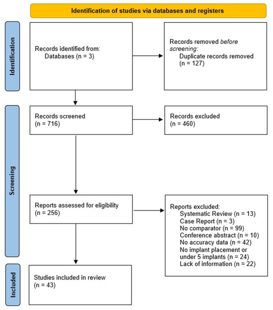 The three-database search yielded 843 records (Figure 1, PRISMA 2020). After removal of 127 duplicates, 716 unique records were screened at title/abstract level, excluding 460. Two-hundred and fifty-six full-text articles were assessed for eligibility. Of these, 208 were excluded: 13 systematic reviews, 3 case reports, 99 non-comparative reports, 10 conference abstracts, 42 without quantitative accuracy data, 24 with no implant placement or <5 implants, and 22 lacking essential methodological information, including cadaveric investigation that did not meet the eligibility criteria. This left 43 primary investigations for qualitative synthesis.