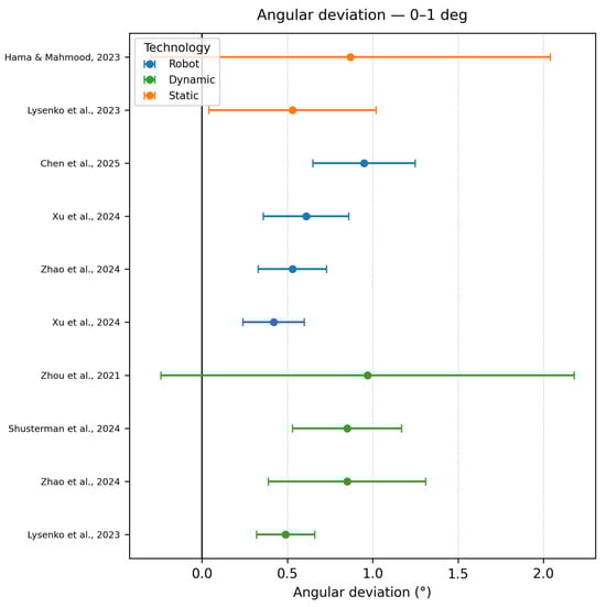Sub-degree control (0–1°, n = 10) is achieved largely by dynamic (four datasets) and robotic workflows (six) []. (dynamic AR) reaches 0.70 ± 0.29°. Two static fully guided bench datasets from Lysenko et al., 2023 [] (0.49 ± 0.17°) and Du et al., 2025 [] showed the highest point in this range as a robotic study but kept its low deviation at a range of ±0.3. The values regarding this range of precision are represented in Figure 3.