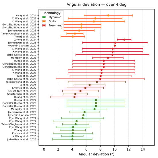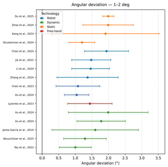 Fifteen datasets clustered between 1 and 2°. Again, dynamic navigation dominated, but single values for both static guides (e.g., Zhao et al., 2024 [] 1.87 ± 0.44°) and freehand (Lysenko et al., 2023 [], 1.44 ± 0.67°) were present. The dispersion of static data supports the meta-analytic observation by Yu et al., 2023 [] that angular advantages of dynamic over static guidance average ≈0.8° yet overlap in individual trials. Robotic approaches pose a good dispersion of the accuracy, as shown in Figure 4.