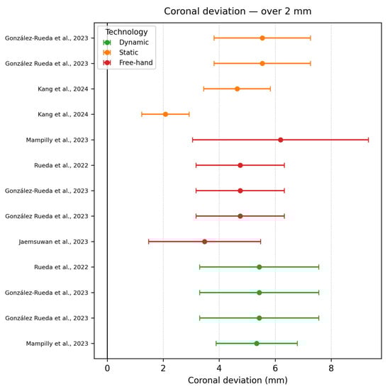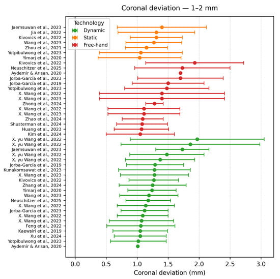 Thirty-six datasets lay between 1 and 2 mm (Figure 8). This is the zone where static and dynamic distributions overlap, confirming meta-analytic equivalence for linear metrics. Tao et al., 2022 [] with a deviation of 1.06 ± 0.59 are the only remaining robotic systems remaining in this range. Stefanelli et al., 2020 [] reported that dynamic navigation manages to get close to the lower limit of 1 mm, with 3–4 tooth tracing yielding 1.17 ± 0.31 mm and 5–6 tooth tracing 0.88 ± 0.37 mm (pooled mean ~1.01 mm), showing that optical tracking can still provide good outcomes if registration is carefully performed on multiple landmarks. By contrast, Li et al., 2024 [] static-guide protocol produced a slightly higher global apical deviation of 1.24 ± 0.52 mm, strongly influenced by the fabrication tolerances of the surgical guides. The distribution of freehand techniques is already scarce in this graph, suggesting a majority in the next graph.
