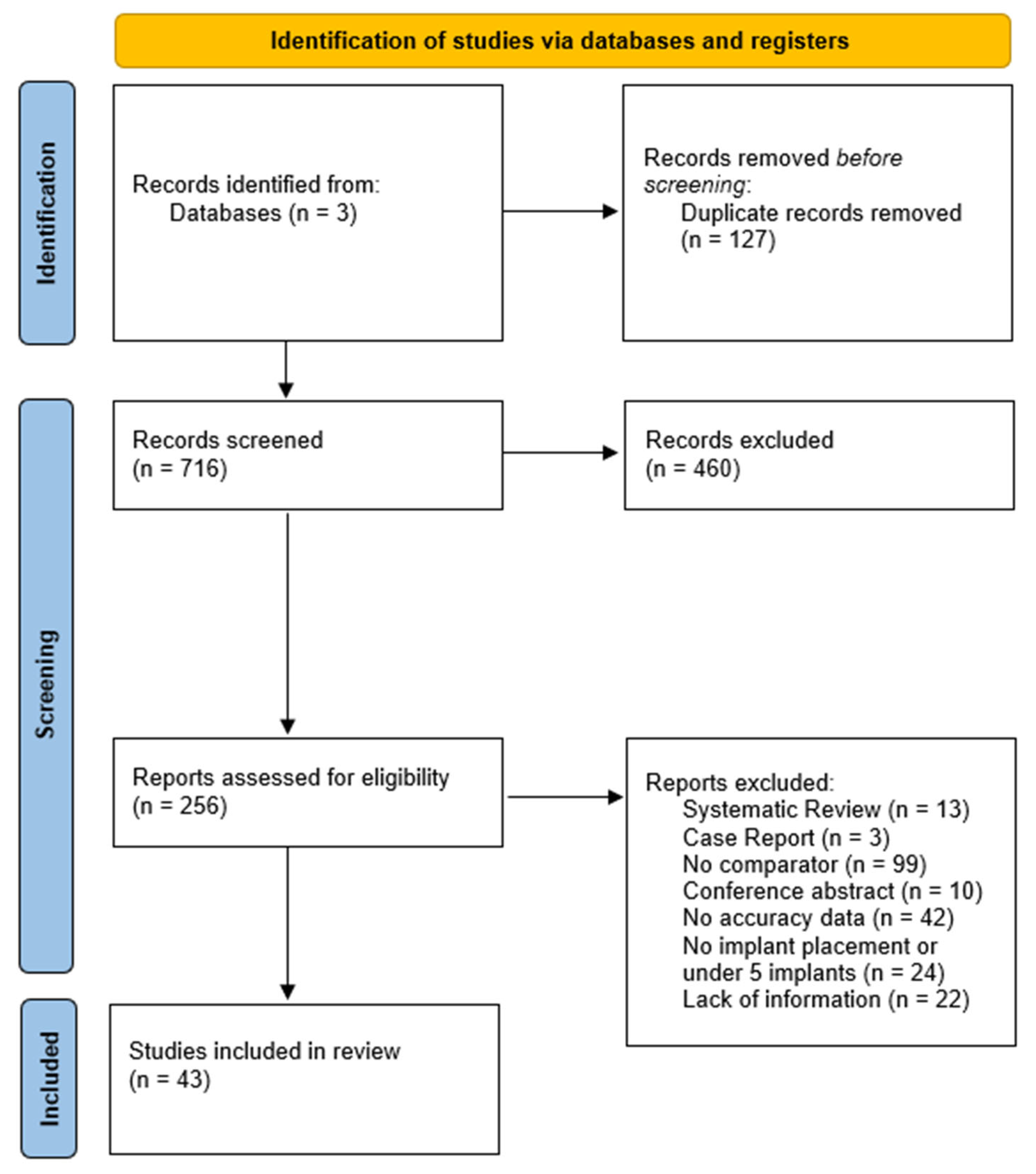| Lysenko et al. [31] | In vitro study | SCAIS DCAIS FREEHAND | OptiTrack 13 Prime Exoplan v3.0 (Exocad GmbH, Darmstadt, Germany) | Conv | 3 | 63 | NR | NR | SCAIS: 0.53 ± 0.49° |